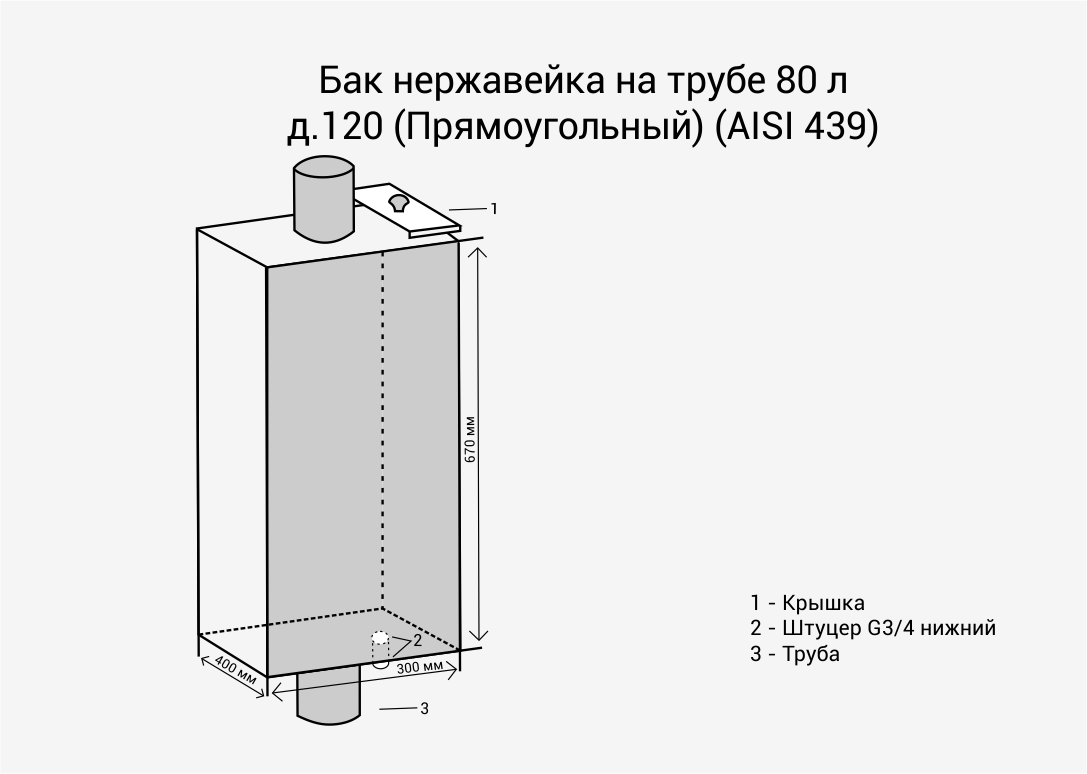 Прямоугольная ёмкость из нержавеющей стали, обладающей высокими прочностными и пластическими свойства, что дает более высокую стабильность структуры этой стали при нагреве и сварке. Принцип работы бака основан на использовании тепла, получаемого от сжигания в банной печи твёрдого топлива.