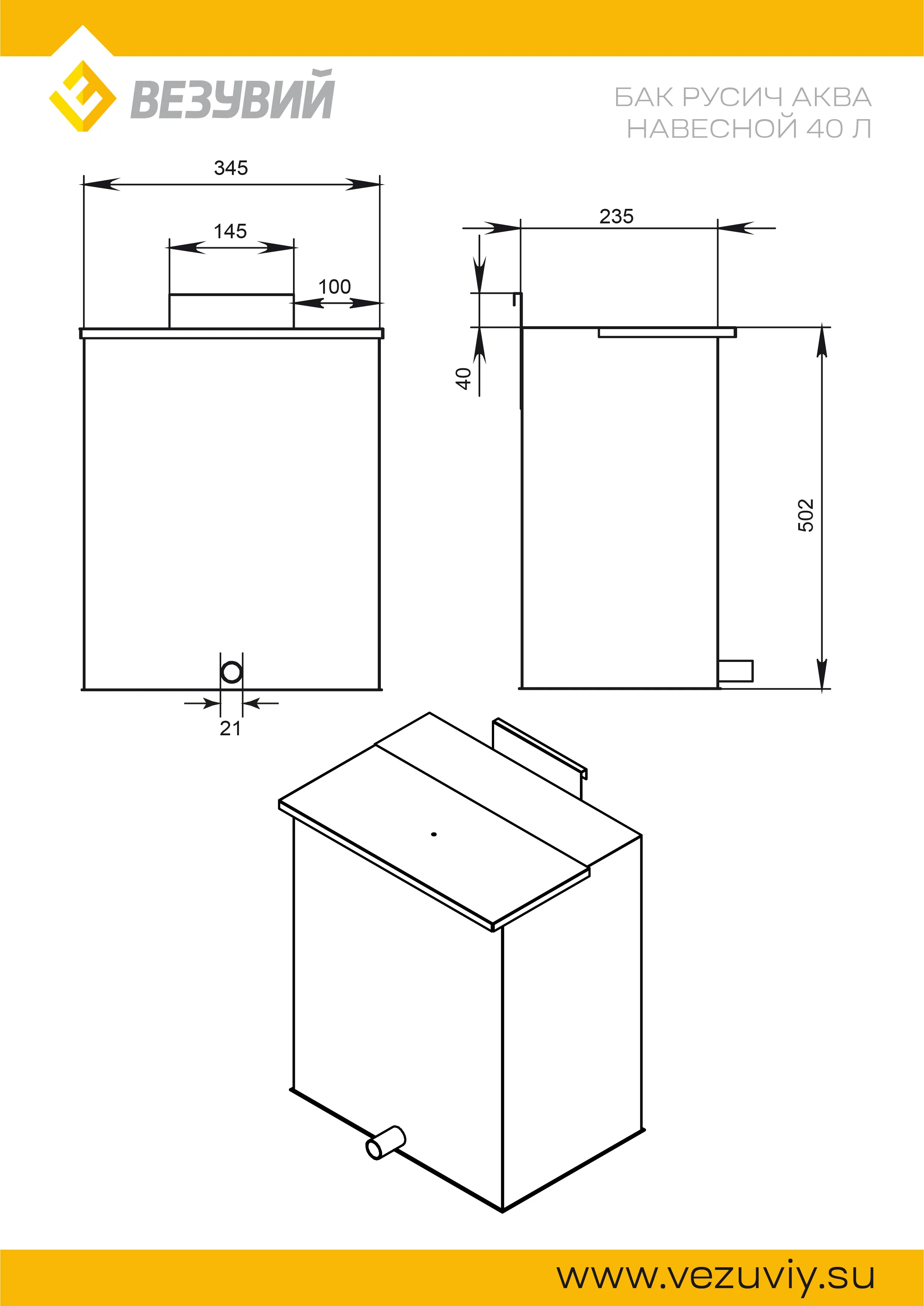 Бак предназначен для подогрева воды.Устанавливается с помощью совмещения навесных элементов бака и печи.Бак можно расположить, как с левой, так и с правой стороны печи.Имеет компактные размеры.Нагрев воды зависит от температуры горения. Долго сохраняет тепло за счет длительного остывания печи.Выполнен из нержавеющей стали AISI 439.