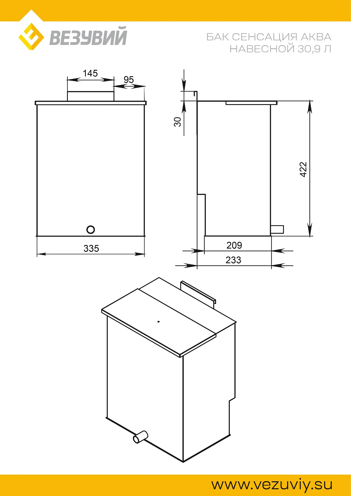 Бак предназначен для подогрева воды. Устанавливается с помощью совмещения навесных элементов бака и печи. Бак можно расположить, как с левой, так и с правой стороны печи. Имеет компактные размеры. Нагрев воды зависит от температуры горения. Долго сохраняет тепло за счет длительного остывания печи. Выполнен из нержавеющей стали AISI 439