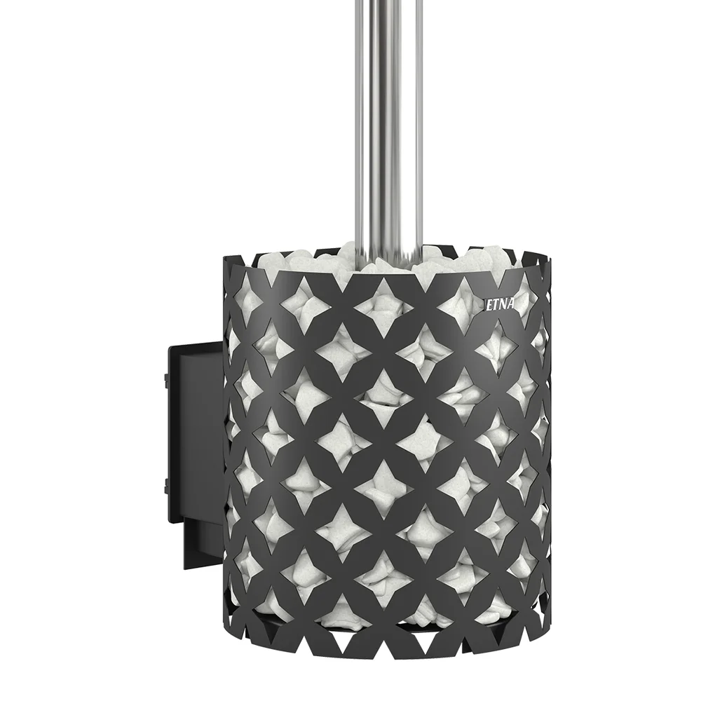 Для устройства наружной открытой каменки печь ЭТНА 18 оснащается металлическим кожухом с прорезным рисунком оригинального дизайна. Пространство между печью и кожухом из двухмиллиметровой стали заполняется камнями для бани, которые выполняют роль теплонакопителя, перераспределяют тепло от стенок топки и защищают парящихся от жёсткого инфракрасного излучения. Воду подают на нагретые камни, с которых полученный пар распространяется по всему объёму парной. Кожух диаметром 560 миллиметров вмещает в себя до 110 килограммов камней крупной и средней фракции.
