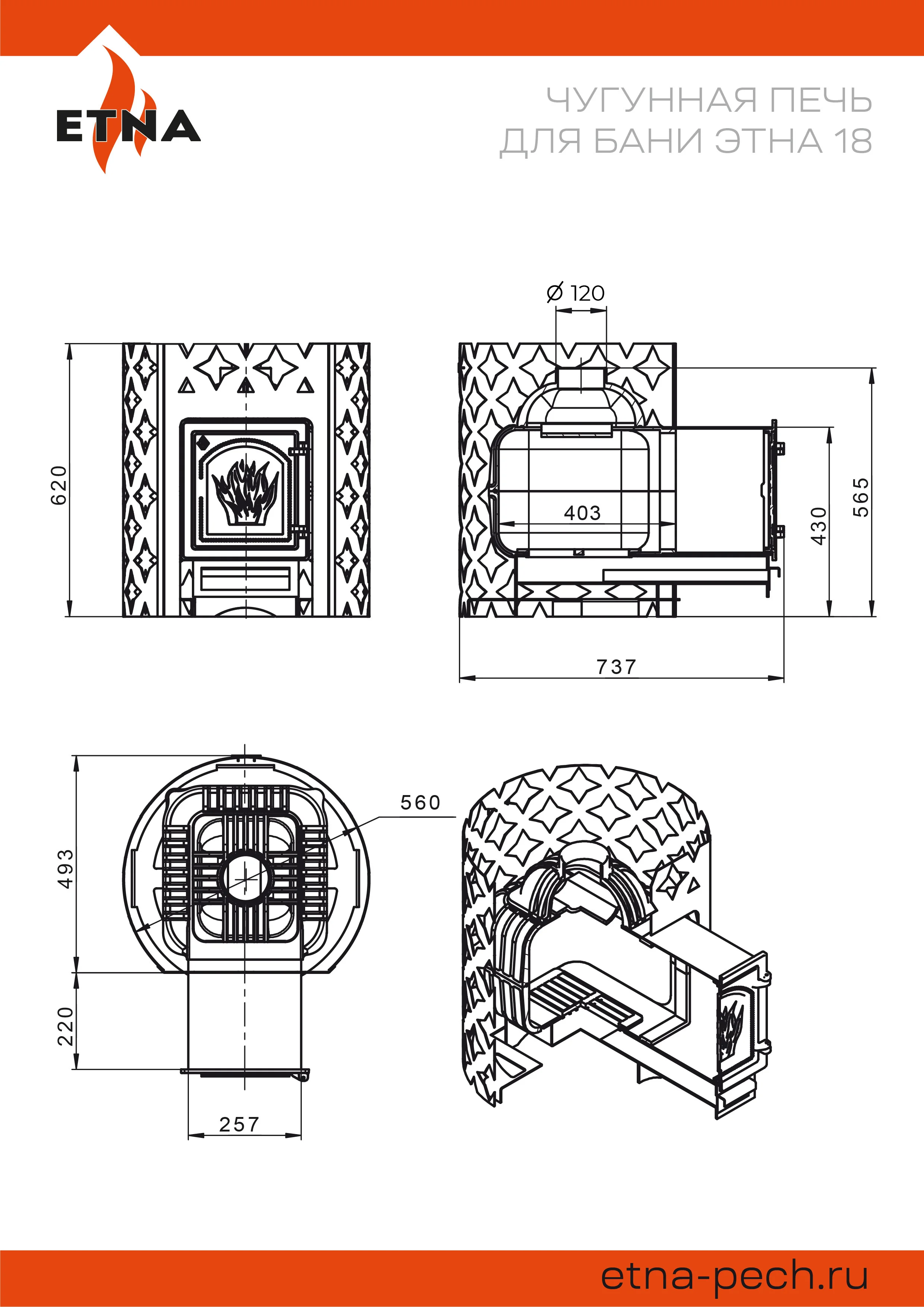 Банная печь ЭТНА 18 ДТ-4С изготовлена из чугуна высокого качества. Материал с высокой теплопроводностью, чугун быстро передаёт энергию сжигаемого топлива наружу, в пространство парной. Толщина деталей корпуса составляет 6-8 миллиметров.