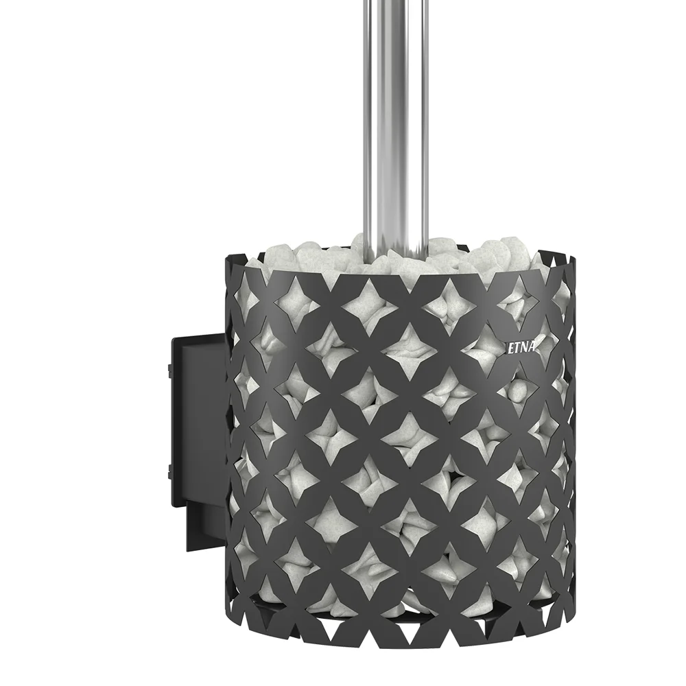 Для устройства наружной открытой каменки печь ЭТНА 24 оснащается металлическим кожухом с прорезным рисунком оригинального дизайна. Пространство между печью и кожухом из двухмиллиметровой стали заполняется камнями для бани, которые выполняют роль теплонакопителя, перераспределяют тепло от стенок топки и защищают парящихся от жёсткого инфракрасного излучения. Воду подают на нагретые камни, с которых полученный пар распространяется по всему объёму парной.