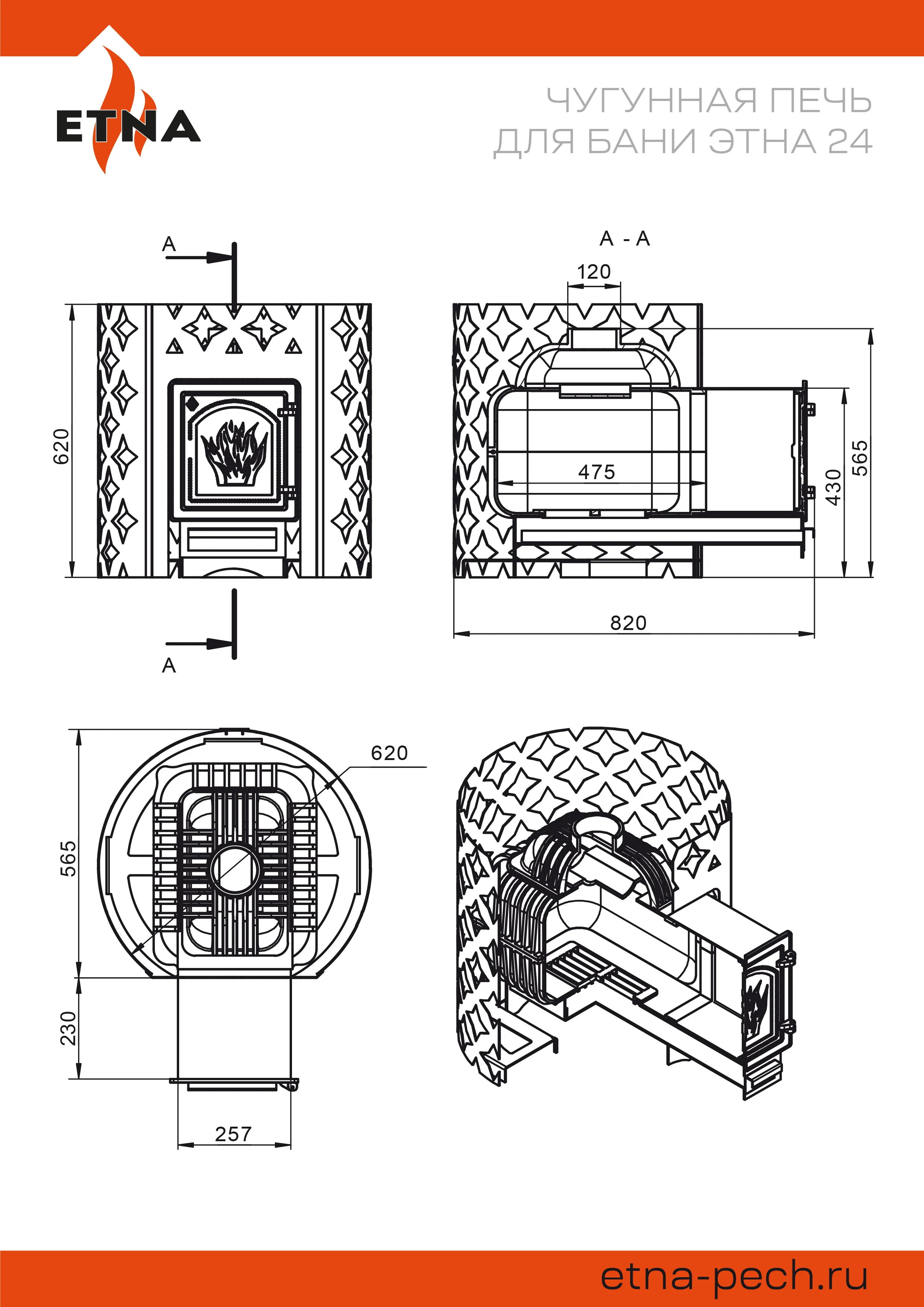 Банная печь ЭТНА 24 ДТ-4С изготовлена из чугуна высокого качества. Материал с высокой теплопроводностью, чугун быстро передаёт энергию сжигаемого топлива наружу, в пространство парной. Толщина деталей корпуса составляет 6-8 миллиметров.
