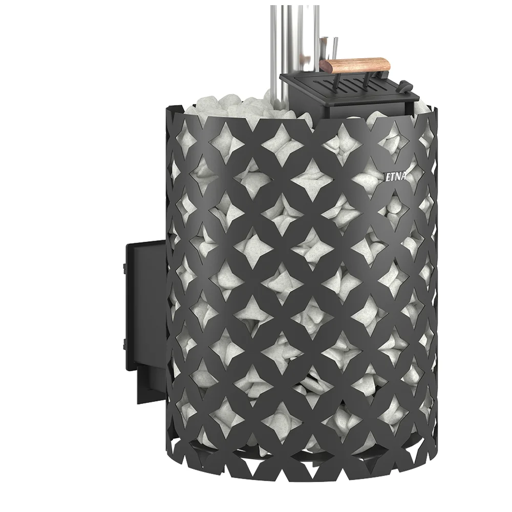 Для устройства наружной открытой каменки печь ЭТНА ЗК 24 оснащается металлическим кожухом с прорезным рисунком оригинального дизайна. Пространство между печью и кожухом из двухмиллиметровой стали заполняется камнями для бани, которые выполняют роль теплонакопителя, перераспределяют тепло от стенок топки и защищают парящихся от жёсткого инфракрасного излучения. Воду подают на нагретые камни, с которых полученный пар распространяется по всему объёму парной.