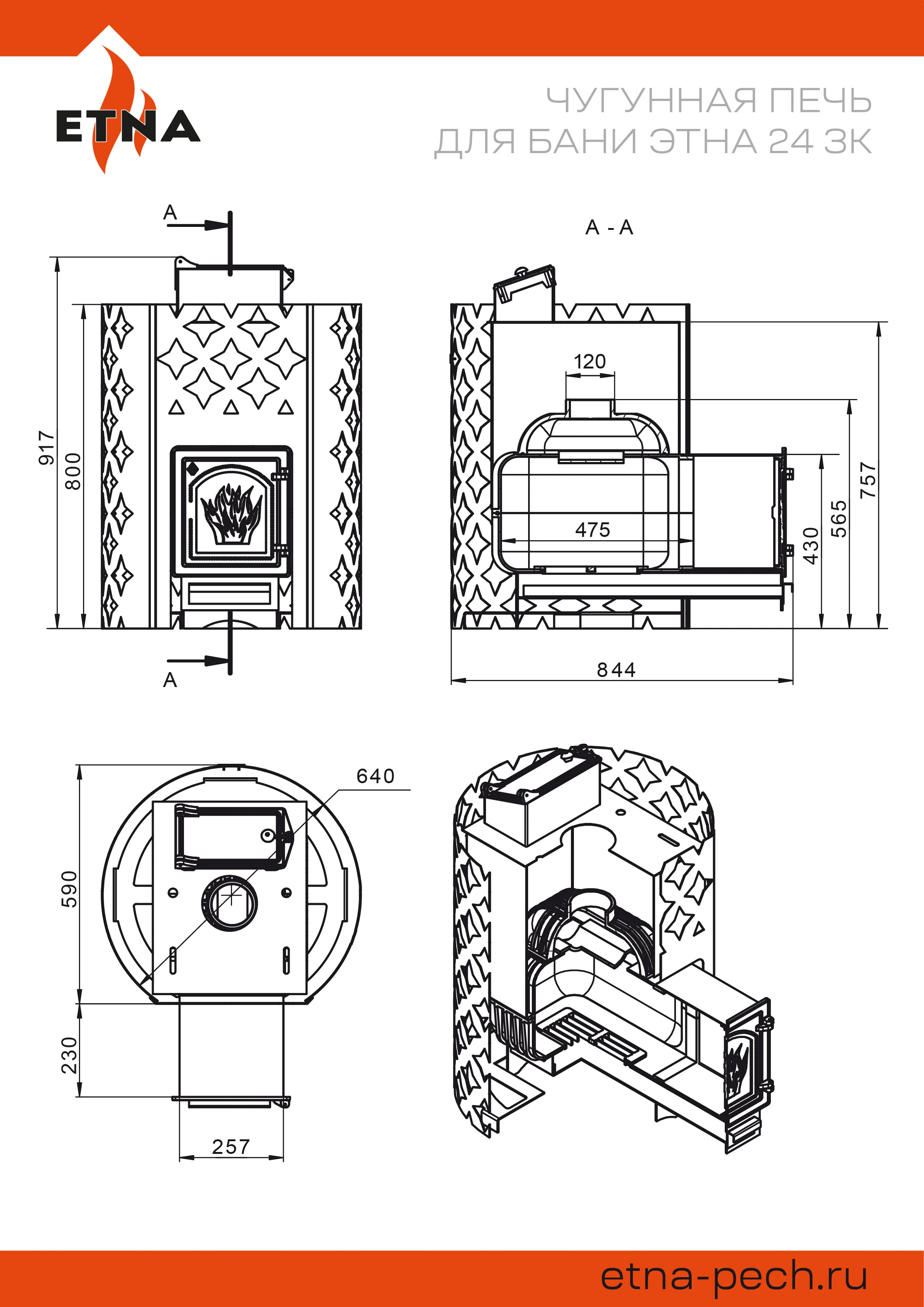 Банная печь ЭТНА ЗК 24 ДТ-4С изготовлена из чугуна высокого качества. Материал с высокой теплопроводностью, чугун быстро передаёт энергию сжигаемого топлива наружу, в пространство парной. Толщина деталей корпуса составляет 6-8 миллиметров.