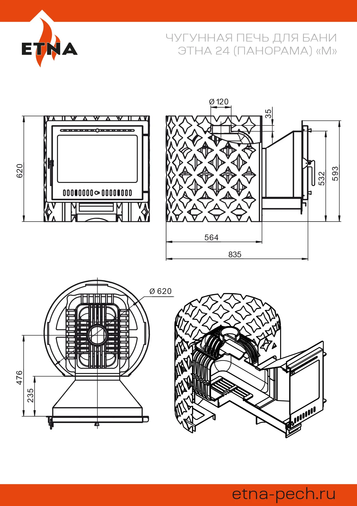 Чугунная банная печь ЭТНА 24 Панорама М оснащается стальной дверкой артикул Панорама М. Печь рассчитана на обогрев парной объёмом до 24 кубических метров. С помощью этой модели обеспечивается быстрый равномерный прогрев парной, поддержание необходимой температуры и получение достаточного количества пара. Дверка панорамная, горизонтального размещения, оснащена створкой с термостойким стеклом из керамического сплава. Ручка двери при закрывании плотно притягивает полотно дверки к рамке, что предотвращает попадание дыма и горящих газов в помещение. Банная печь ЭТНА 24 Панорама М изготовлена из качественного чугуна. Чугун быстро передаёт энергию сжигаемого топлива наружу, в пространство парилки. Толщина деталей корпуса составляет 6-8 миллиметров. Корпус печи состоит из трёх элементов, собираемых на болтовых соединениях. При сборке между элементами корпуса прокладывается термостойкий керамический шнур, предотвращающий прорыв дымовых газов и пламени в помещение. В нижней части топочной камеры размещается чугунный колосник, предназначенный для подачи воздуха на дрова снизу. Для повышения теплоотдачи и максимального использования энергии горения дров в верхней части топки расположен пламегаситель, изменяющий направление движения дымовых газов и обеспечивающий их полное сгорание. Регулировка скорости горения дров осуществляется за счёт прикрытия заслонки, размещённой в нижней части двери. Заслонка открывает или закрывает щелевидные отверстия для подачи воздуха в поддувальное пространство