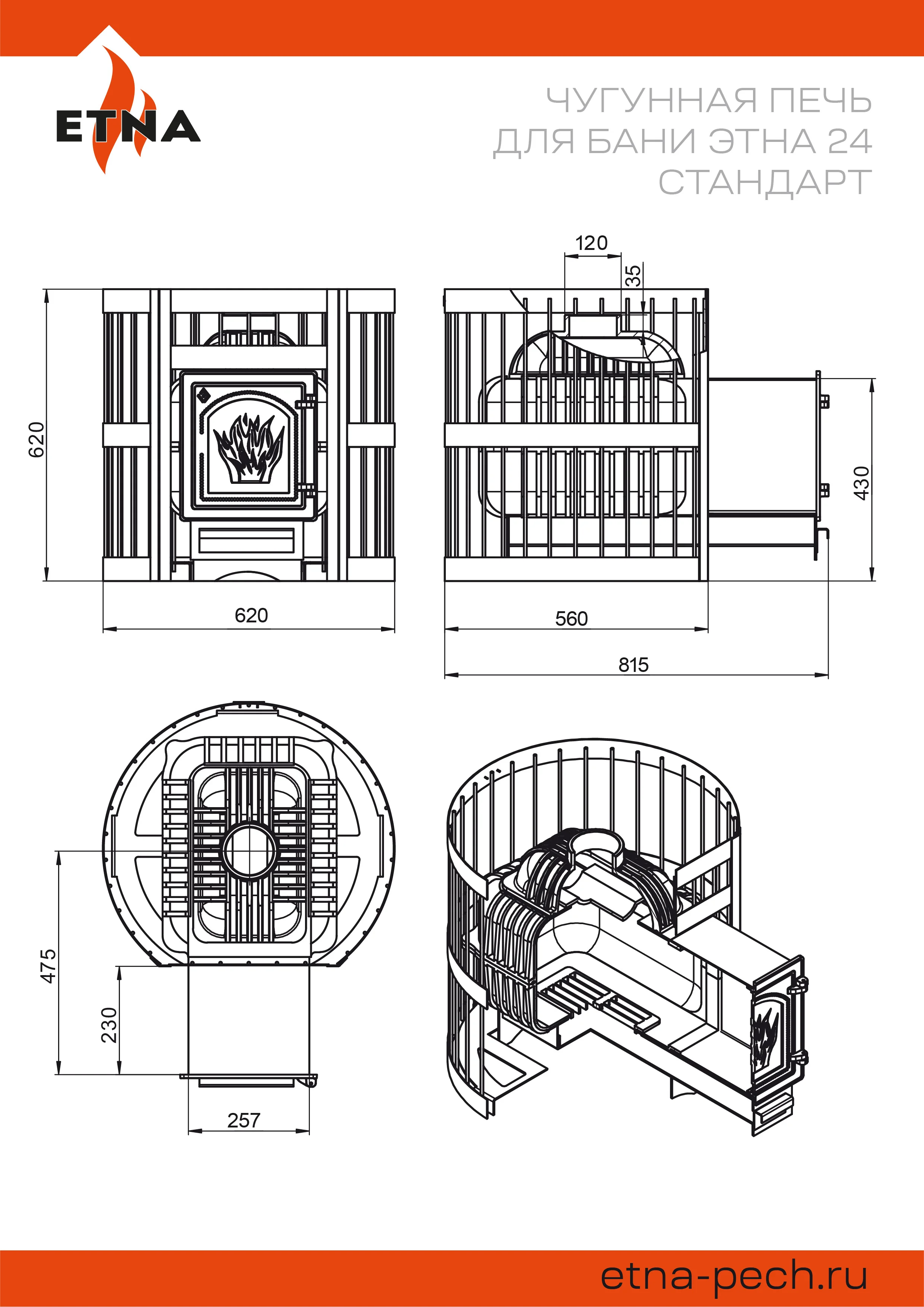 Банная печь ЭТНА 24 ДТ-4 изготовлена из чугуна высокого качества. Материал с высокой теплопроводностью, чугун быстро передаёт энергию сжигаемого топлива наружу, в пространство парной. Толщина деталей корпуса составляет 6-8 миллиметров.