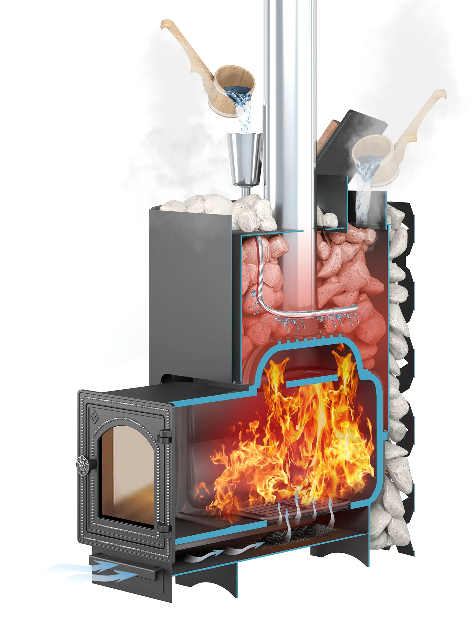 Преимущество банной печи в том, что топка печи состоит из 3-х Чугунных элементов (ГОСТ 1412-85) толщиной до 8мм. На стыке между ними используется керамический шнур с рабочей температурой 1200 градусов. То есть топка печи абсолютно герметична! Для фиксации деталей между собой применяется болтовое соединение, что даёт 100% гарантию безопасности при эксплуатации.