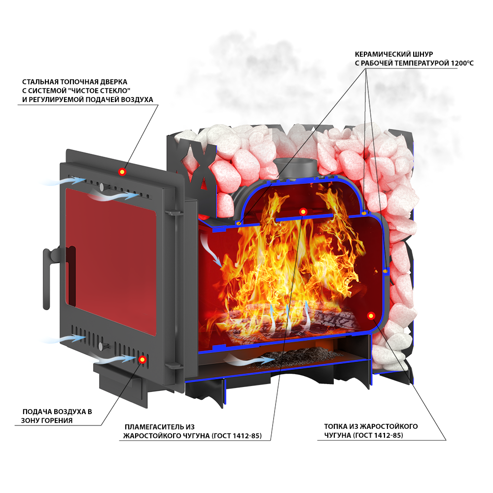 Преимущество банной печи в том, что топка печи состоит из 3-х Чугунных элементов (ГОСТ 1412-85) толщиной до 8мм. На стыке между ними используется керамический шнур с рабочей температурой 1200 градусов. То есть топка печи абсолютно герметична! Для фиксации деталей между собой применяется болтовое соединение, что даёт 100% гарантию безопасности при эксплуатации.