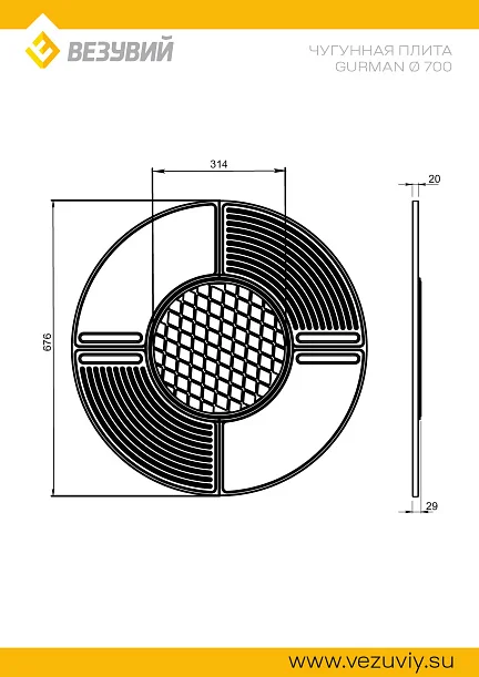 В середине плиты размещина чугунная решётка Везувий Стейк диаметром 314 мм. Эта решётка предназначена для готовки мяса и овощей с красивым диагональным рисунком