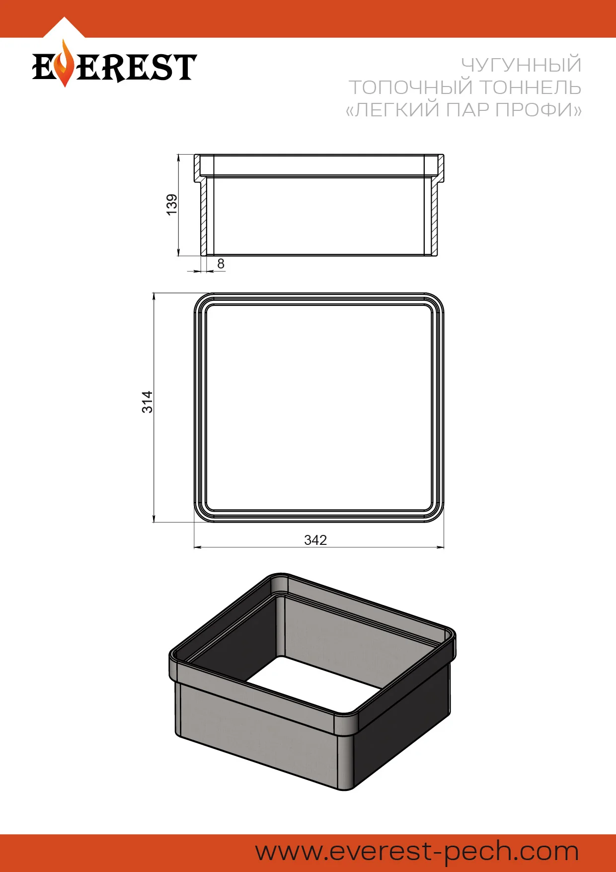 Предназначен для увеличения длины топочного тоннеля в случае, если толщина стены превышает 23 см. Рабочая длина изделия составляет 139 мм. Конструктивно удлинитель повторяет штатный тоннель печи Эверест Лёгкий Пар Профи, изготовлен из жаропрочного чугуна. Устанавливается между рамкой двери печи и штатным участком тоннеля. Удлинитель по периметру фиксируется на термостойкий герметик и закрепляется при помощи удлинённых резьбовых шпилек.