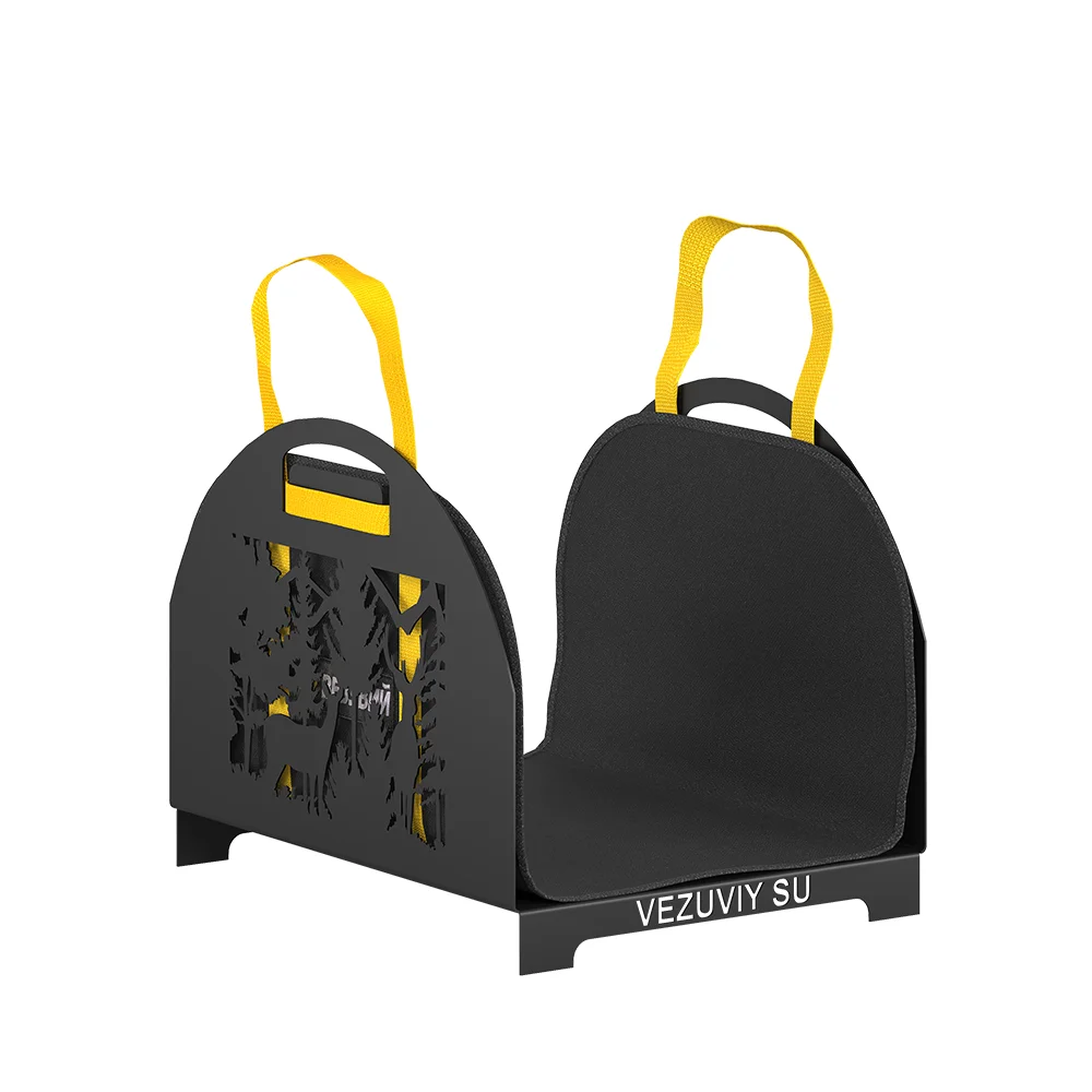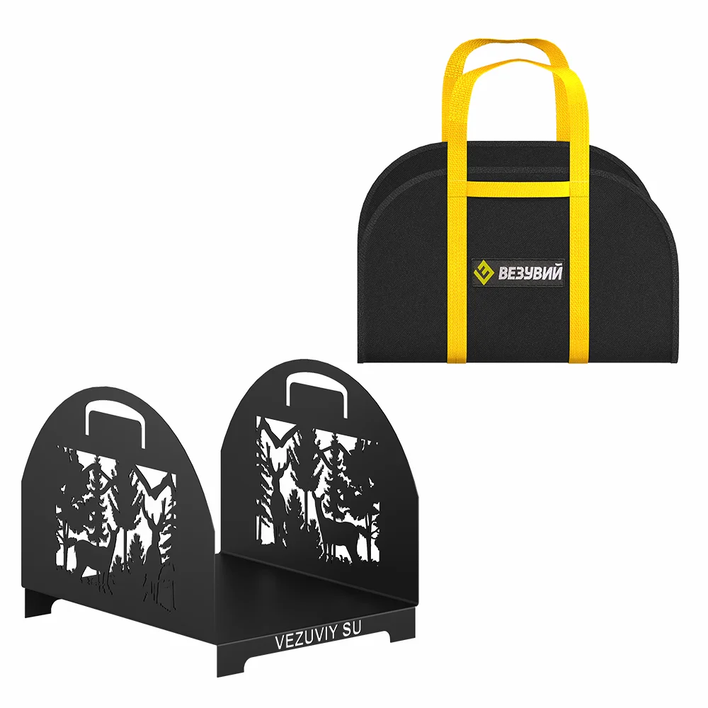 Прорезной узор на боковых поверхностях дровницы отлично сочетается с другими аксессуарами Везувий в стиле «Русский лес». Дровница будет хорошо выглядеть вместе с каминным набором, часами и другими деталями интерьера в этом приятном дизайне. Дровница Везувий «Русский Лес» D430B рассчитана на применение с сумкой для переноски дров S 620, которая поставляется в комплекте. Сумка специальными петлями в развёрнутом виде фиксируется на прорезных ручках дровницы.