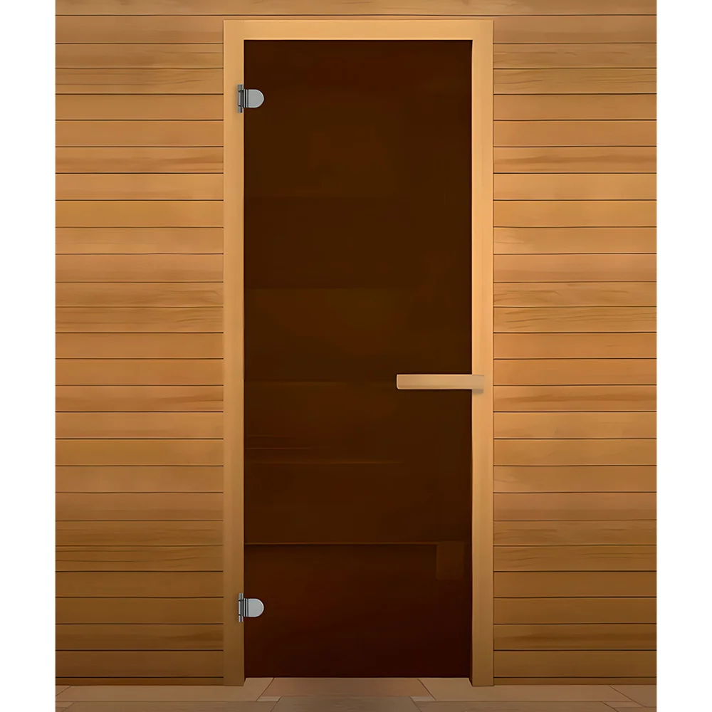 Стеклянная дверь для сауны изготовлена из высокопрочного закалённого стекла, что делает дверь максимально безопасной. Дверная коробка изготовлена из высококлассной срощенной породы древесины.