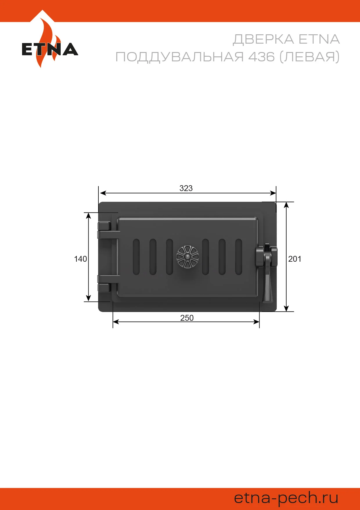 Чугунная дверь ЭТНА артикул 436 предназначена для установки в различные тепловые агрегаты, работающие на твёрдом топливе. Дверь может быть установлена в поддувало серийных и индивидуальных металлических (чугун, сталь, нержавеющая сталь) или кирпичных печей.