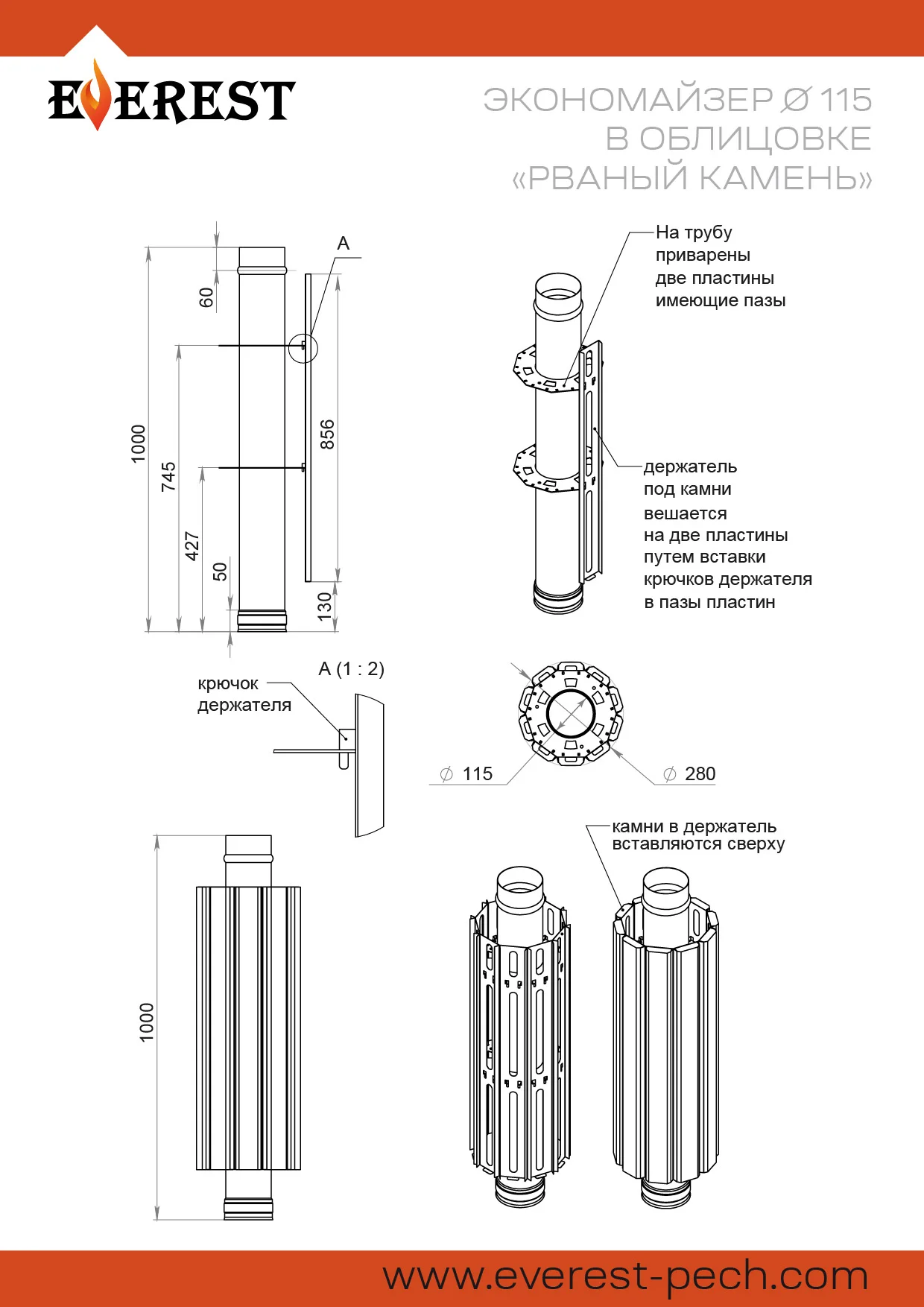 Экономайзер изготовлен из нержавеющей стали толщиной 1 миллиметр, и может быть установлен в качестве замены первого метра дымохода в парной. Конструкция экономайзера предусматривает установку в качестве внешней облицовки десяти ламелей из натурального камня.