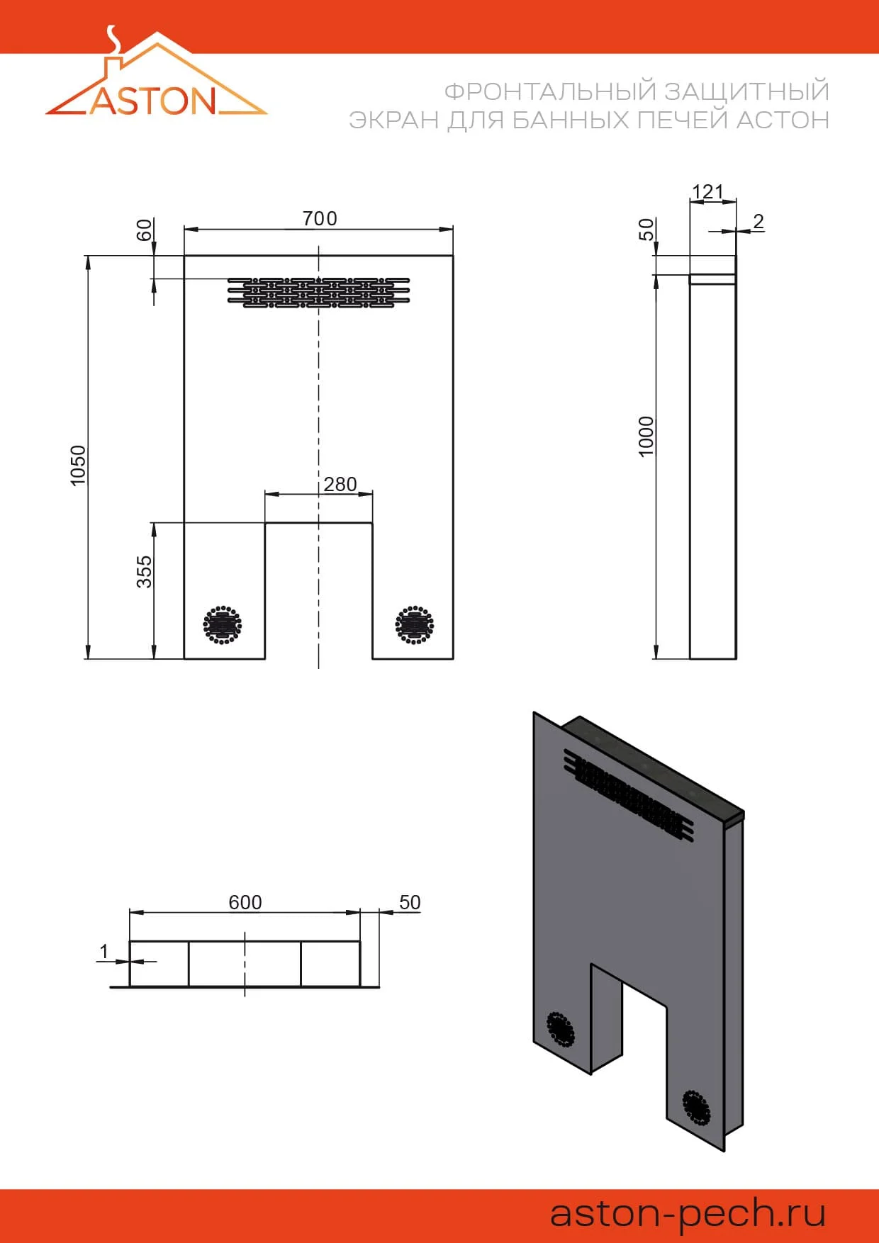 Фронтальный защитный экран применяется для монтажа печей ASTON с целью разграничения пространства парной и комнаты отдыха (или предбанника). Экран отлично подойдёт для обустройства стены из кирпича или другого негорючего материала в случаях, когда нет возможности сделать полноценный портал.