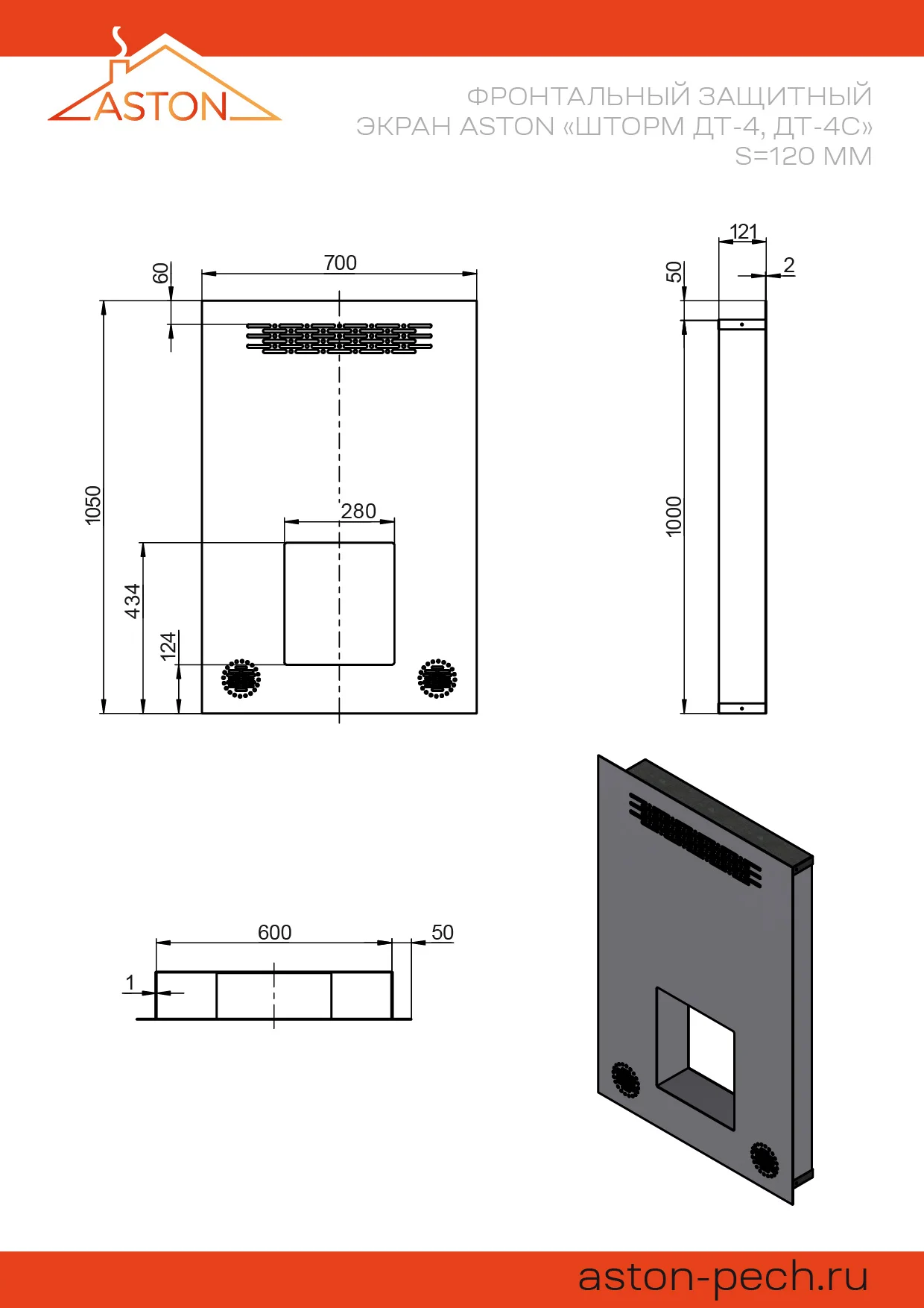 Фронтальный защитный экран применяется для монтажа печей ASTON с целью разграничения пространства парной и комнаты отдыха (или предбанника). Экран отлично подойдёт для обустройства стены из кирпича или другого негорючего материала в случаях, когда нет возможности сделать полноценный портал.