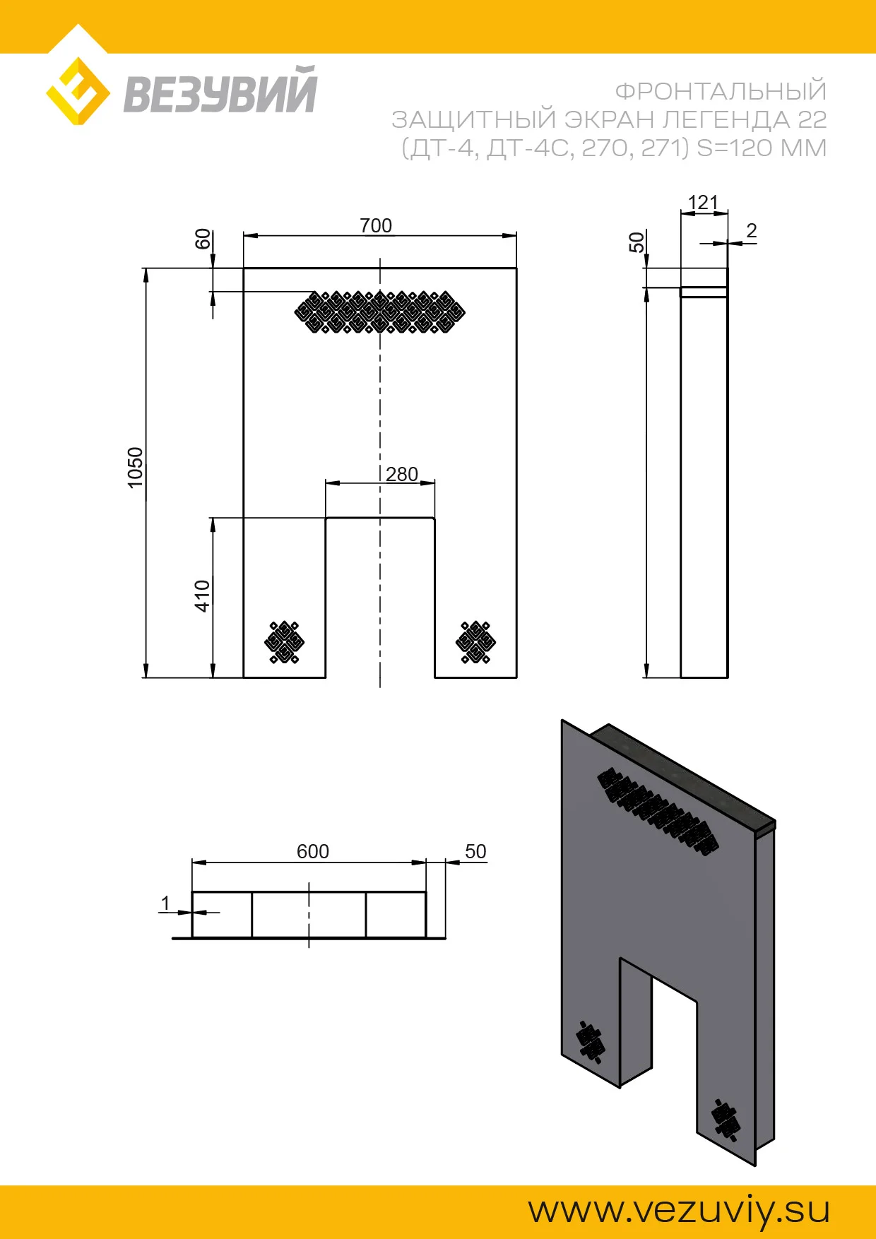 Выполненный из стали толщиной 1-2 миллиметра фронтальный защитный экран выполняет функцию эстетического обрамления топочного тоннеля печи и одновременно защищает смежные с печью поверхности от воздействия повышенных температур. Фронтальный защитный экран сделан в виде П-образной арки, которая обрамляет топочную дверку и топочный тоннель печи. Передняя панель экрана имеет толщину 2 миллиметра, остальные элементы – толщиной 1 миллиметр. Небольшой борт по периметру передней панели позволяет красиво отделать экран и скрыть швы между экраном и стеной. Экран полностью совместим с печью Легенда 22 в модификациях с дверками ДТ-4, ДТ-4С, 270, 271. Размеры портала и арки точно соответствуют печам указанных моделей и не требуют предварительной подгонки по месту. После установки экрана печь полностью сохраняет свои размерные и функциональные характеристики.Экран окрашен термостойкой краской, которая выдерживает высокие температуры, возникающие в топочном тоннеле во время работы печи.Фронтальный экран устанавливается на топочный тоннель сверху, позволяет на своей основе собрать стену между парной и предбанником из кирпича (толщина портала равна 121 миллиметру) или дерева.