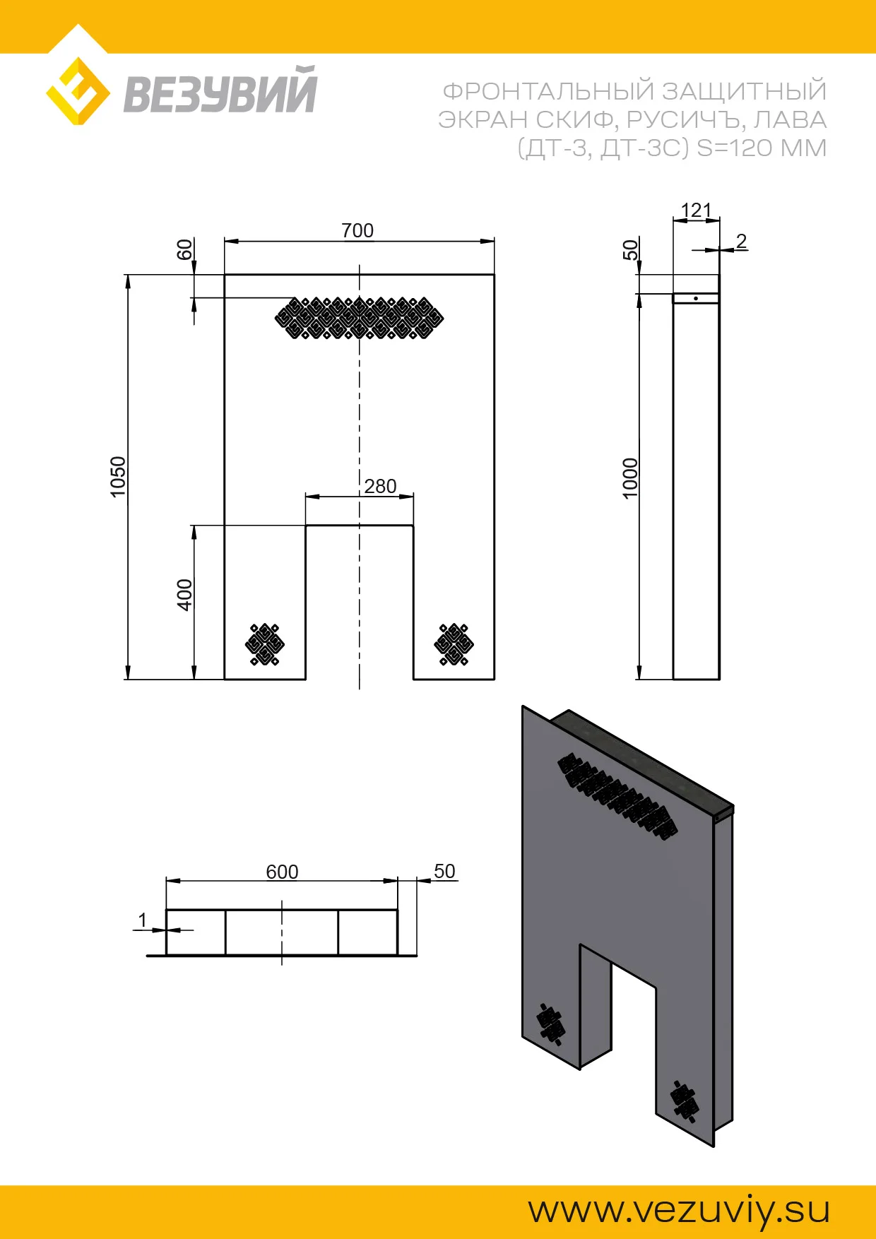 Выполненный из стали толщиной 1-2 миллиметра фронтальный защитный экран выполняет функцию эстетического обрамления топочного тоннеля печи и одновременно защищает смежные с печью поверхности от воздействия повышенных температур. Фронтальный защитный экран сделан в виде П-образной арки, которая обрамляет топочную дверку и топочный тоннель печи. Передняя панель экрана имеет толщину 2 миллиметра, остальные элементы – толщиной 1 миллиметр. Небольшой борт по периметру передней панели позволяет красиво отделать экран и скрыть швы между экраном и стеной. Экран полностью совместим с печами Скиф, Русичъ, Лава 16, 22, 28 в модификациях с дверками ДТ-4,ДТ-4С. Размеры портала и арки точно соответствуют печам указанных моделей и не требуют предварительной подгонки по месту. После установки экрана печь полностью сохраняет свои размерные и функциональные характеристики.Экран окрашен термостойкой краской, которая выдерживает высокие температуры, возникающие в топочном тоннеле во время работы печи.Фронтальный экран устанавливается на топочный тоннель сверху, позволяет на своей основе собрать стену между парной и предбанником из кирпича (толщина портала равна 121 миллиметру) или дерева.Большая воздушная камера между передней и задней стенками экрана предотвращает теплопотери и делает использование изделия максимально безопасным. За счёт этой камеры передняя поверхность экрана нагревается незначительно, что предохраняет пользователя от ожогов.