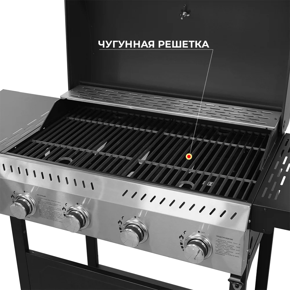 Важная особенность данного гриля, это чугунная решетка с площадью приготовления 71Х42 см, что позволяет одновременно готовить разные блюда и контролировать процесс готовки. Гриль оборудован термостатом для контроля стабильной температуры, что обеспечивает более равномерное приготовление пищи и качество ее прожарки.