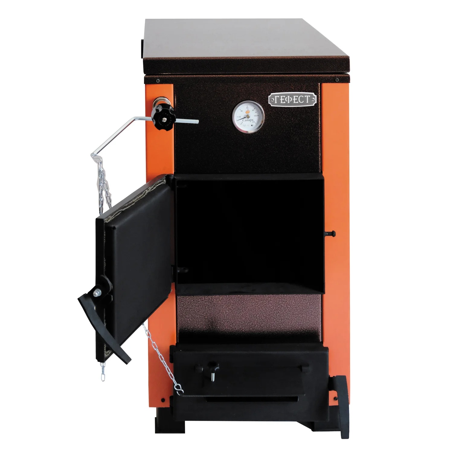 Котел "Гефест" 20 кВт - это идеальное решение для отопление загородного дома площадью до 200 м2. Источником топлива при этому могут быть дрова, прессованные брикеты, уголь. Котел "Гефест" 20 кВт вобрал в себя передовые технологии котельного производства, продвинутые инженерные решения и дизайнерский перфекционизм.Данный котел предназначен для установки в системы водяного отопления с естественной или принудительной циркуляцией теплоносителя. Рабочее давление, необходимое для правильной работы котла в системе отопления составляет не более 2 Бар.Для автоматического управления подачей воздуха в камеру сгорания на дверце зольника установлена воздушная заслонка, через цепочку управляемая энергонезависимым терморегулятором. В верхней части котла "Гефест" 20 кВт имеется загрузочный люк, который облегчает работу по закладке топлива в топочную камеру. Также в конструкции котла "Гефест" 20 кВт предусмотрена возможность установки блока ТЭН, которая позволяет нагревать теплоноситель в системе отопления в осенне-весенний период, когда нужно слегка прогреть помещение для комфортного проживания.