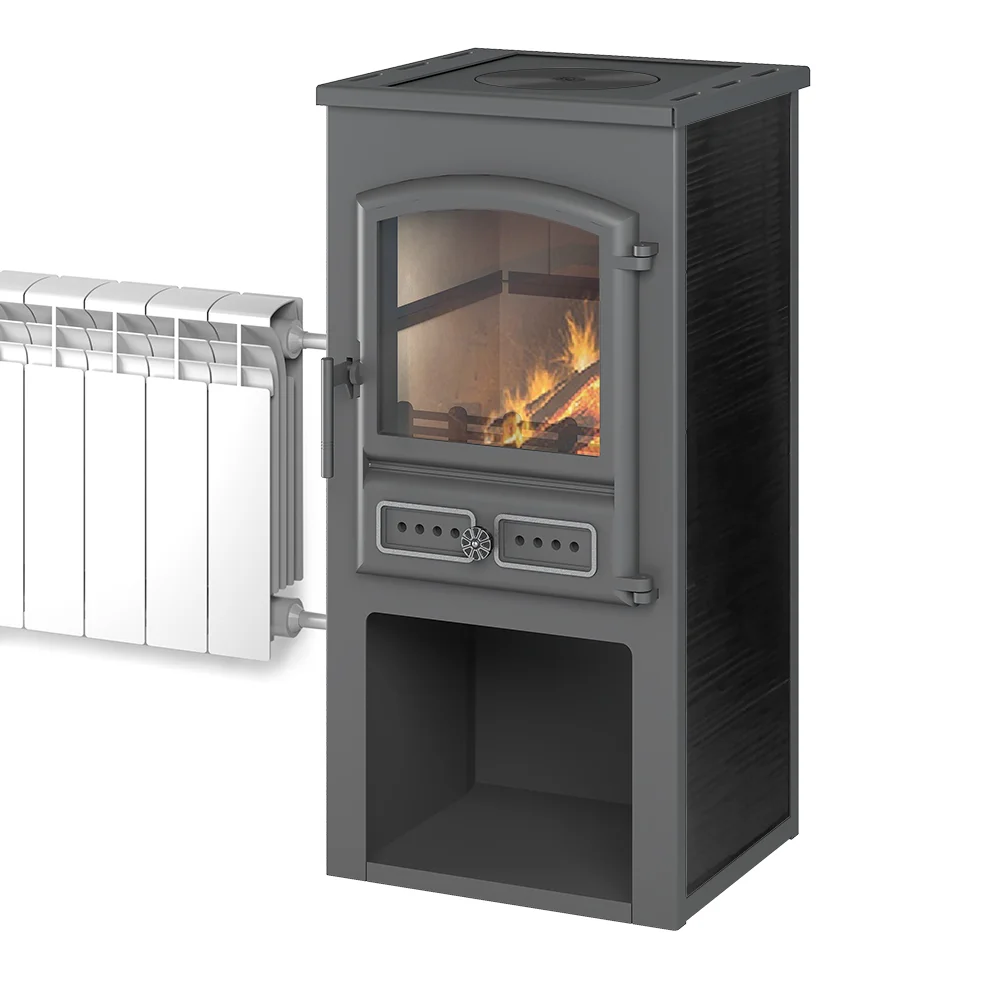 Печь-камин комплектуется чугунной дверкой с остеклением БКД и чугунной плитой на верхней поверхности печи, дополненной съёмными конфорками. В конструкцию печи-камина включён теплообменник, позволяющий на базе этого теплового агрегата организовать водяное отопление в смежных помещениях.