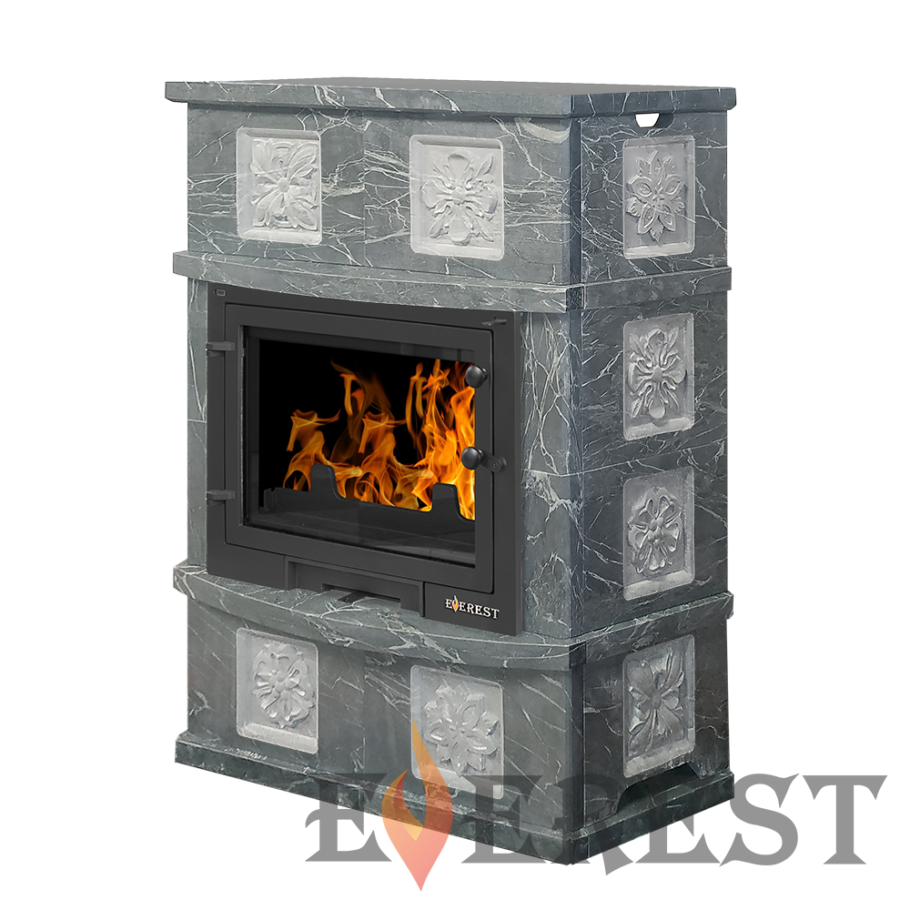 Камин EVEREST D10 «PILLAU» Талькохлорит представляет собой комплект из топки EVEREST 700 и наружной облицовки из натурального камня талькохлорита с резными узорными элементами.