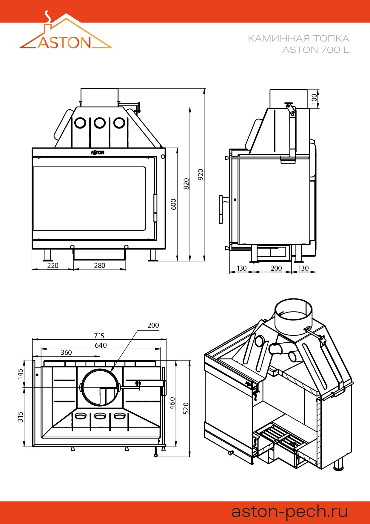 Стальная каминная топка АСТОН 700 L рассчитана на прогрев помещений объёмом до 220 кубических метров. Топочная камера изготовлена из особо прочной котловой стали, рассчитана на пристенное размещение.