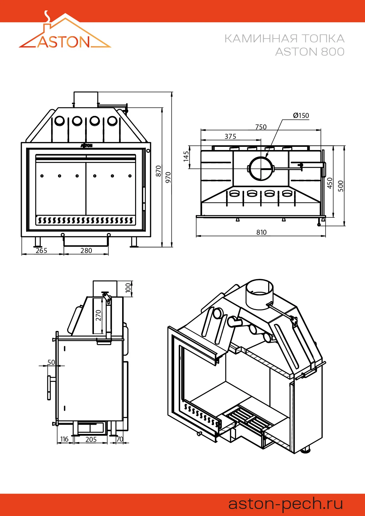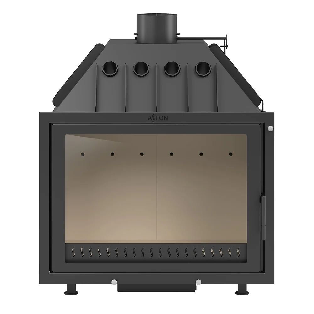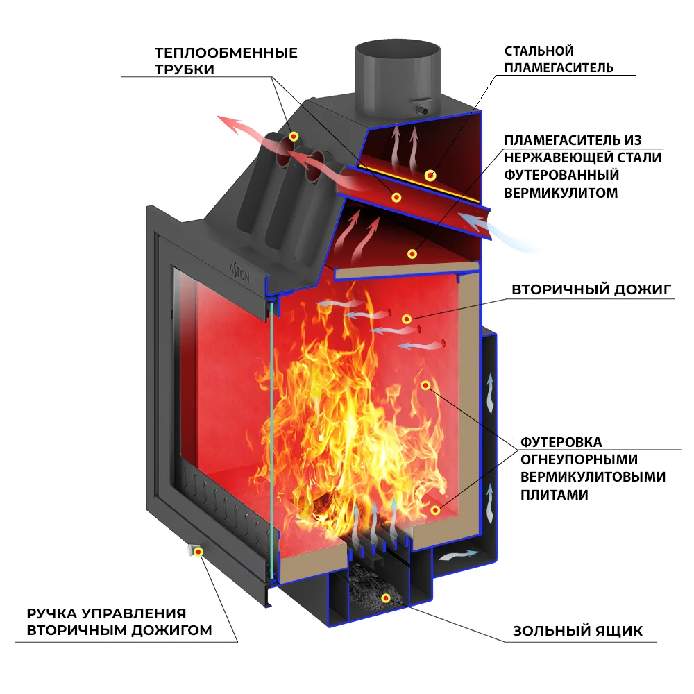Трубы, размещённые над топочной камерой в области дымосборника, увеличивают скорость движения нагретого воздуха и усиливают конвекционные возможности каминной топки АСТОН 800. Пламя и дымовые газы, догорая, огибают пламегаситель в верхней части топочной камеры. В дымосборнике. над конвекционными трубами, расположен второй пламегаситель, который повторно меняет направление движения газов и таким образом способствует их полному догоранию в топке. За счёт совместной работы двух пламегасителей достигается максимальная тепловая эффективность каминной топки АСТОН 800, в том числе повышается теплоотдача печи путём усиления конвекции.