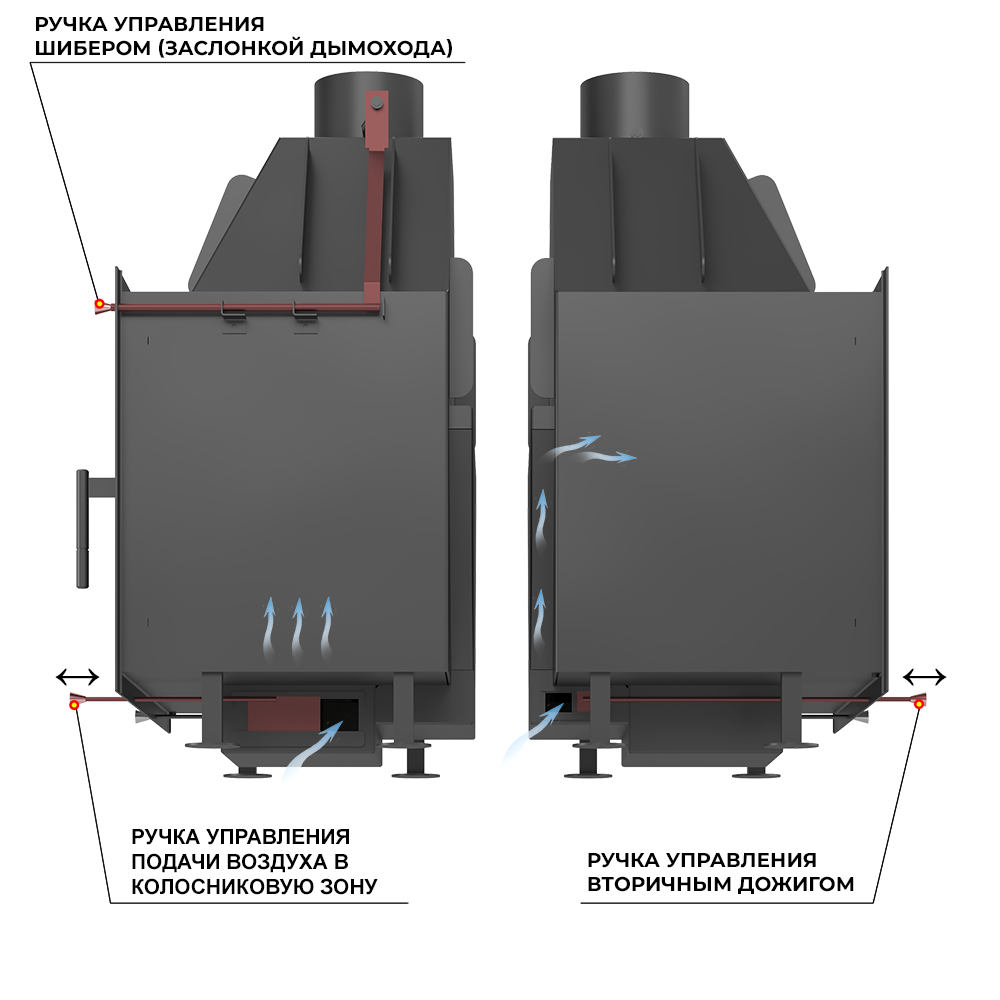 Регулирование тяги возможно с использованием шибера, встроенного в патрубок дымохода диаметром 150 мм. Ручка управления шибером размещается на передней поверхности топки, справа вверху.