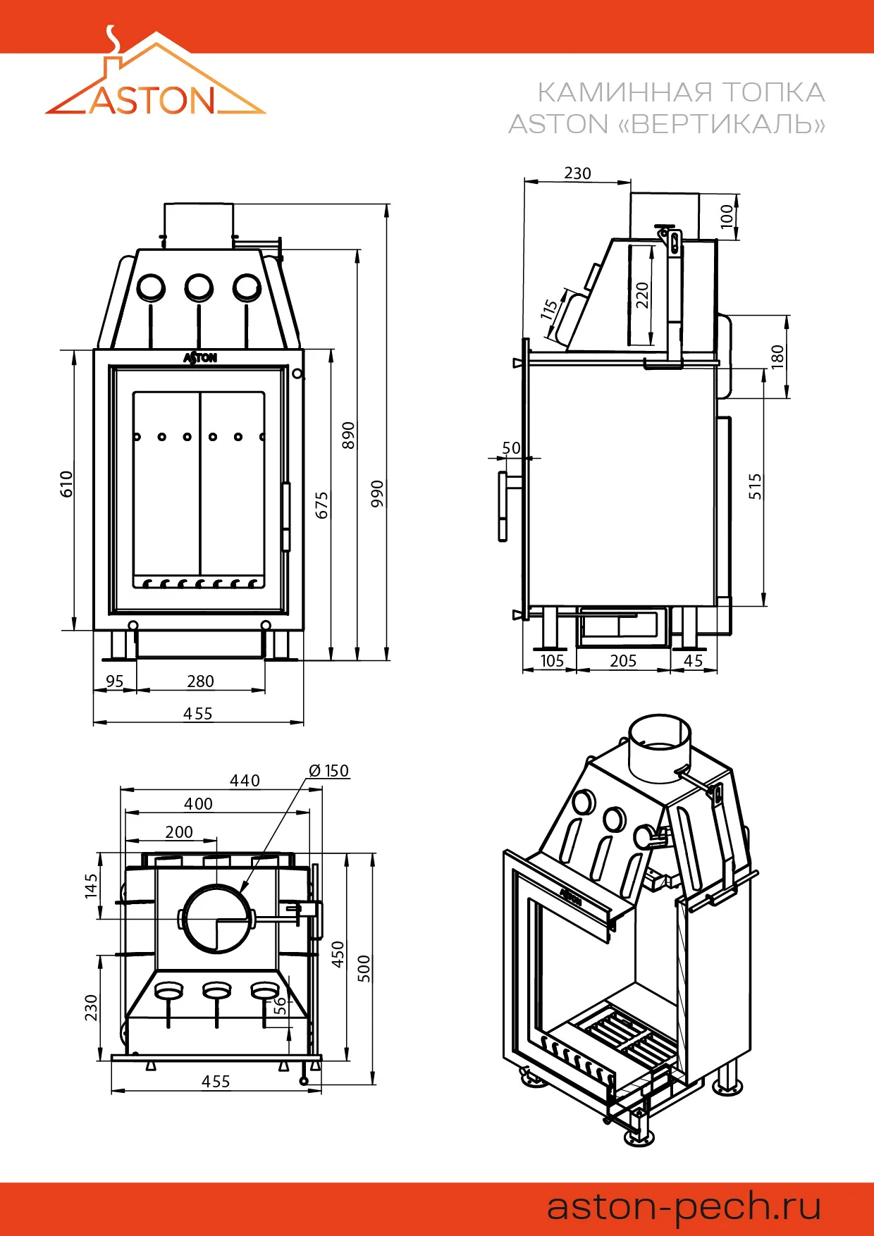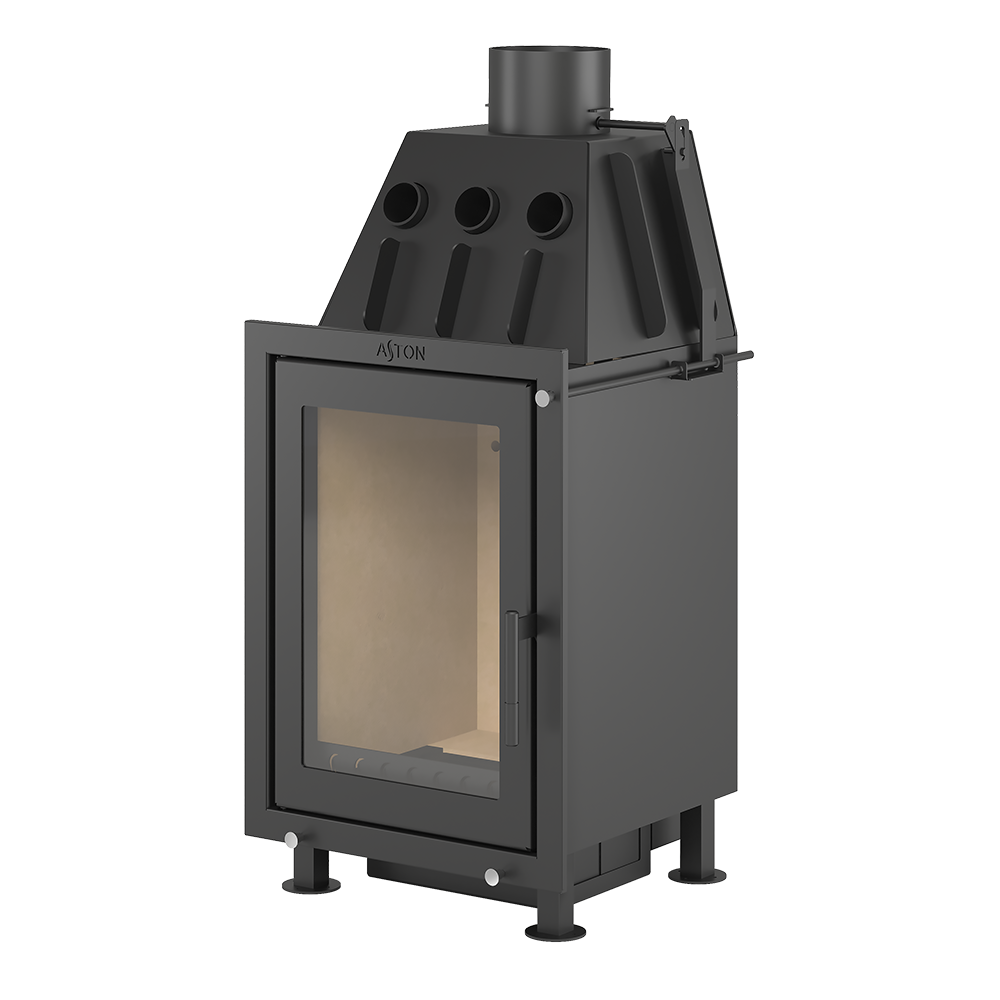 Стальная каминная топка АСТОН ВЕРТИКАЛЬ рассчитана на прогрев помещений объёмом до 210 м³.Топка ориентирована вертикально, что делает её более компактной по занимаемой площади. Оптимально смотрится в интерьере, дизайн которого предполагает движение вверх.Топочная камера изготовлена из особо прочной котловой стали, рассчитана на пристенное размещение. Топка изнутри облицована вермикулитом, что обеспечивает максимальную теплоёмкость печи. Вермикулитовая облицовка защищает стены от прогорания и избыточного нагрева.Топка оборудована системой вторичного дожига дымовых газов, которая позволяет получить максимум энергии при горении дров. Каналы вторичного дожига расположены на задней стенке топочной камеры непосредственно в вермикулитовой облицовке. Управление вторичным дожигом вынесено на переднюю панель топкиТрубы, размещённые над топочной камерой в области дымосборника, увеличивают движение нагретого воздуха и усиливают конвекционные возможности каминной топки АСТОН ВЕРТИКАЛЬ.Пламя и дымовые газы, догорая, огибают пламегаситель в верхней части топочной камеры. Пламегаситель изготовлен из вермикулита и предназначен для полного сжигания дымовых газов в дымосборнике каминной топки.Дверь топки оснащена панорамным термостойким стеклом, позволяющим наблюдать за горением огня и контролировать наполнение топки. Керамическое стекло выдерживает температуру до 650 градусов и устойчиво к резким перепадам температур. Вертикальная ориентация двери и стекла делает внешний вид установленной топки изящным и очень интересным.Тяга регулируется за счёт шибера, встроенного в патрубок дымохода диаметром 150 мм. Ручка управления шибером размещается на передней поверхности топки, справа вверху.