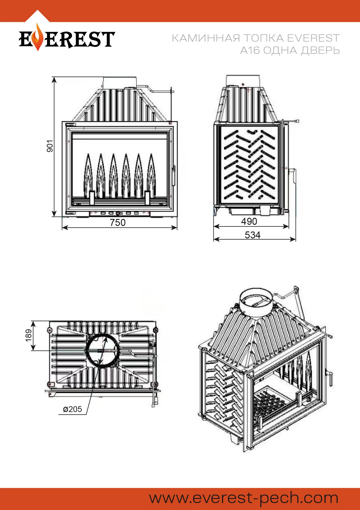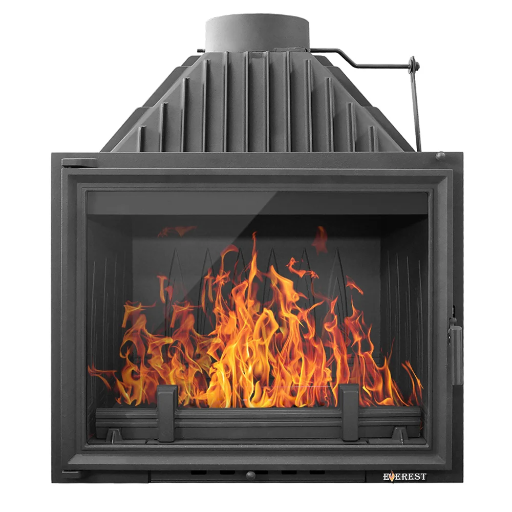 Каминная топка EVEREST A16 топка изготовлена из качественного жаростойкого чугуна (ГОСТ 1412-85) с толщиной стенок 6-10 мм. Вес топки составляет кг. Модель рассчитана на обогрев помещений объёмом до 320 м³. Каминная топка имеет высокую Аккумуляционную камеру (дымосборник) и часто расположенные радиаторы на корпусе топки , которые обеспечивают высокий КПД и увеличивают мощность до 16 кВт. В Аккумуляционной камере (дымосборнике) установлен чугунный пламегаситель, Патрубок дымохода с внутренним диаметром 205 мм, оснащён поворотным шибером. Заслонка изготовлена из чугуна, а её положение регулируется ручкой на передней панели топки.