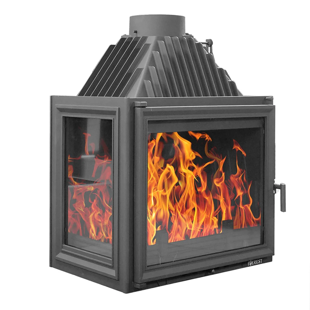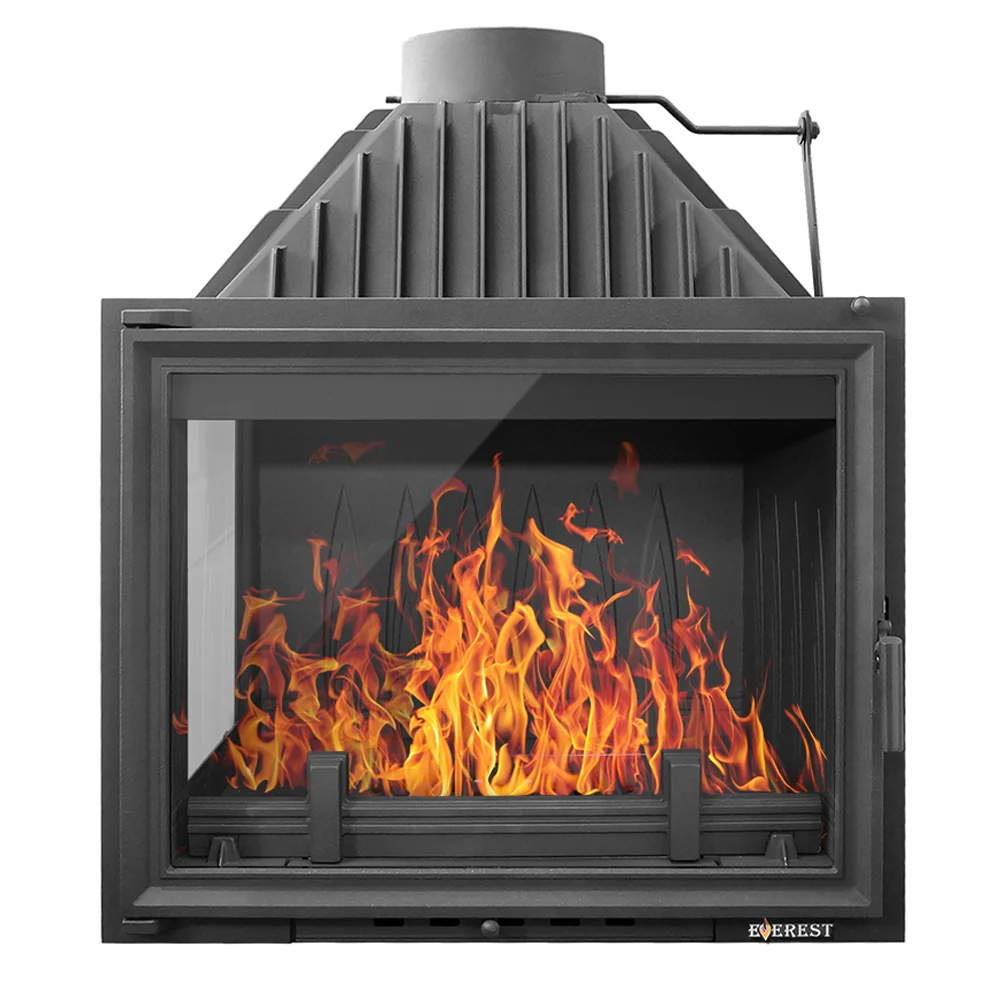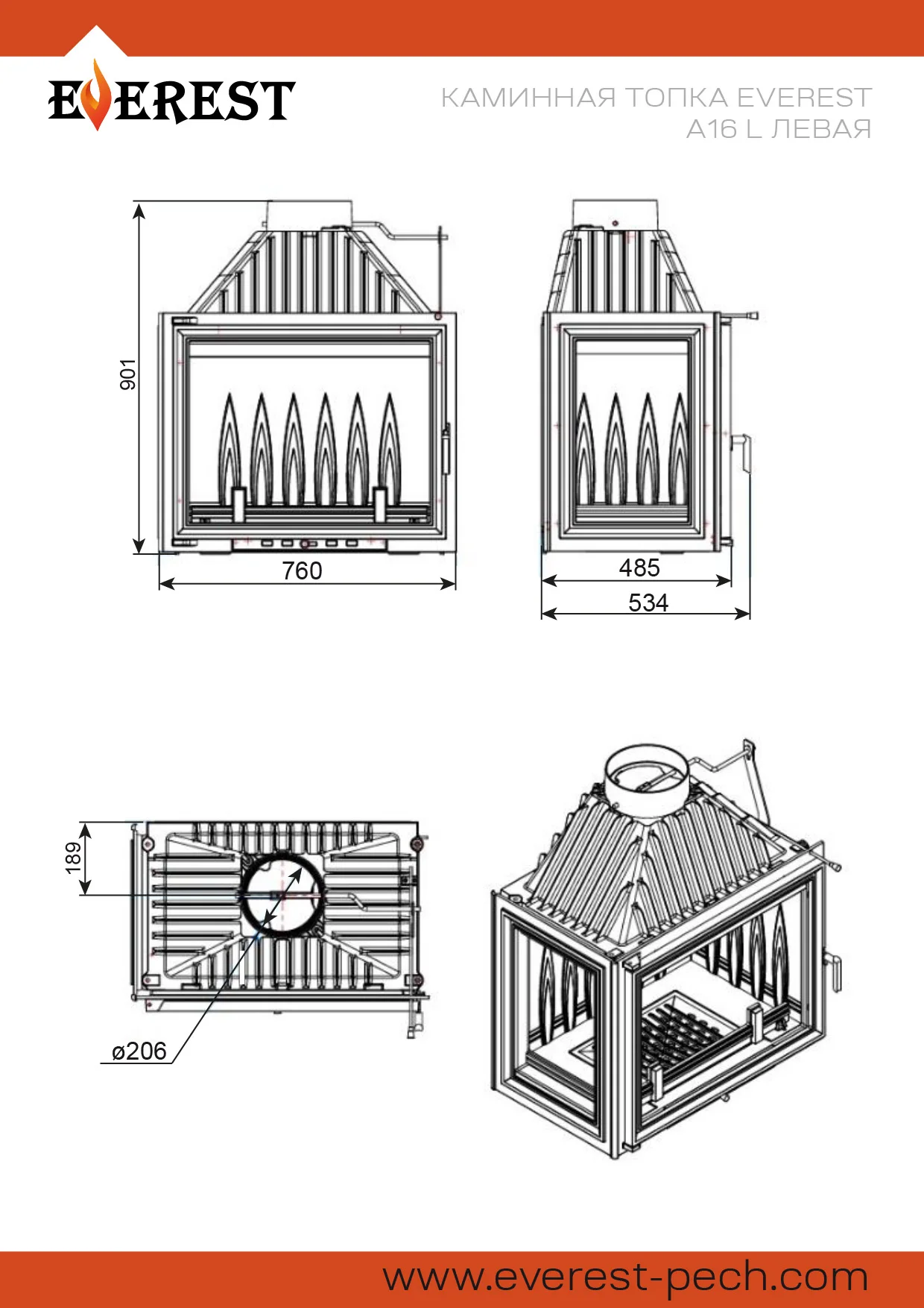 Каминная топка EVEREST A16L имеет с правой стороны дополнительное остекление. Топка изготовлена из качественного жаростойкого чугуна (ГОСТ 1412-85) с толщиной стенок 6-10 мм. Вес топки составляет 186 кг. Модель рассчитана на обогрев помещений объёмом до 320 м³. Каминная топка имеет высокую Аккумуляционную камеру (дымосборник) и часто расположенные радиаторы на корпусе топки , которые обеспечивают высокий КПД и увеличивают мощность до 16 кВт. В Аккумуляционной камере (дымосборнике) установлен чугунный пламегаситель, Патрубок дымохода с внутренним диаметром 203 мм, оснащён поворотным шибером. Заслонка изготовлена из чугуна, а её положение регулируется ручкой на передней панели топки.