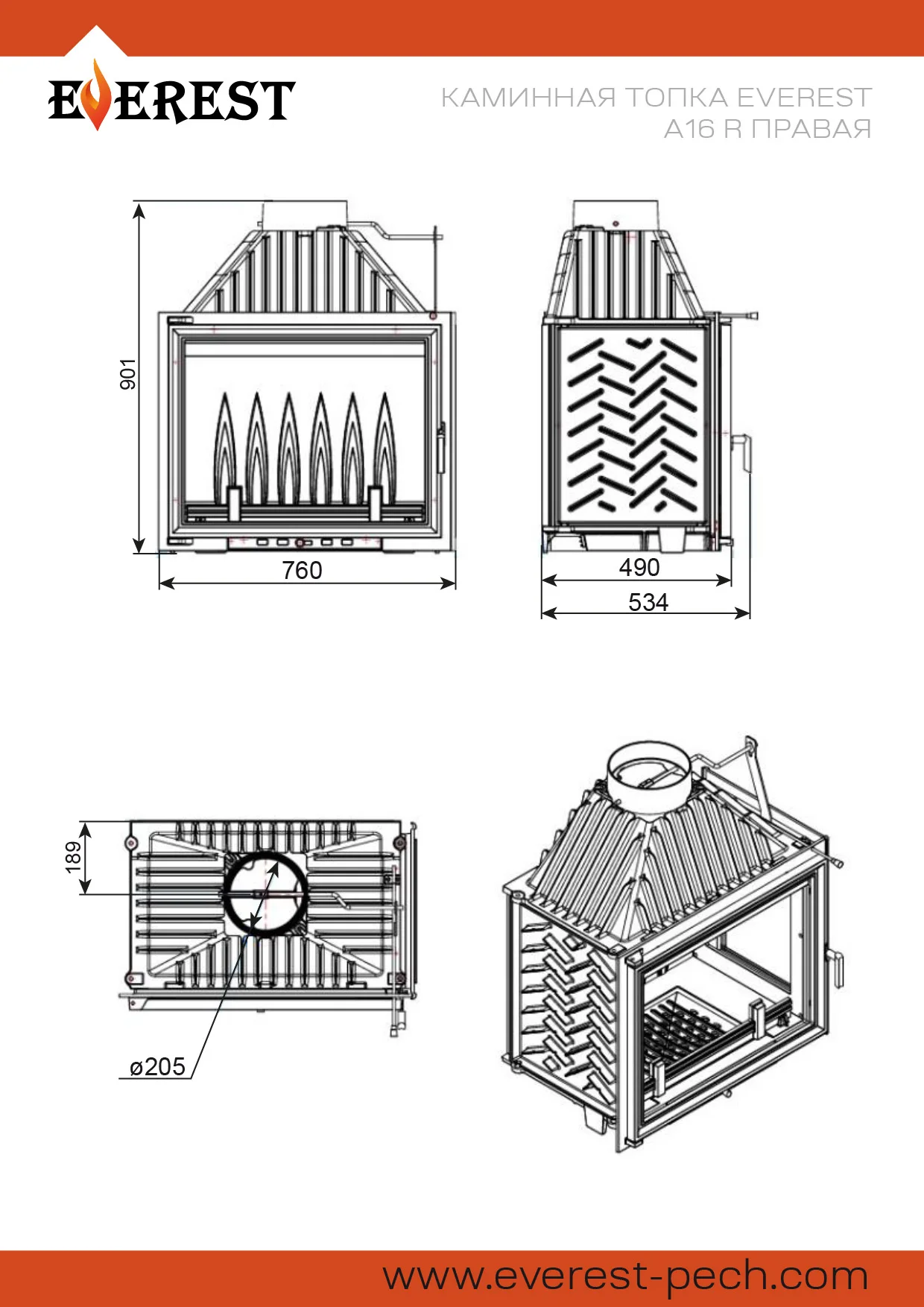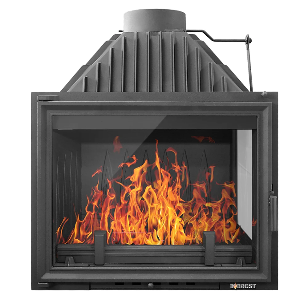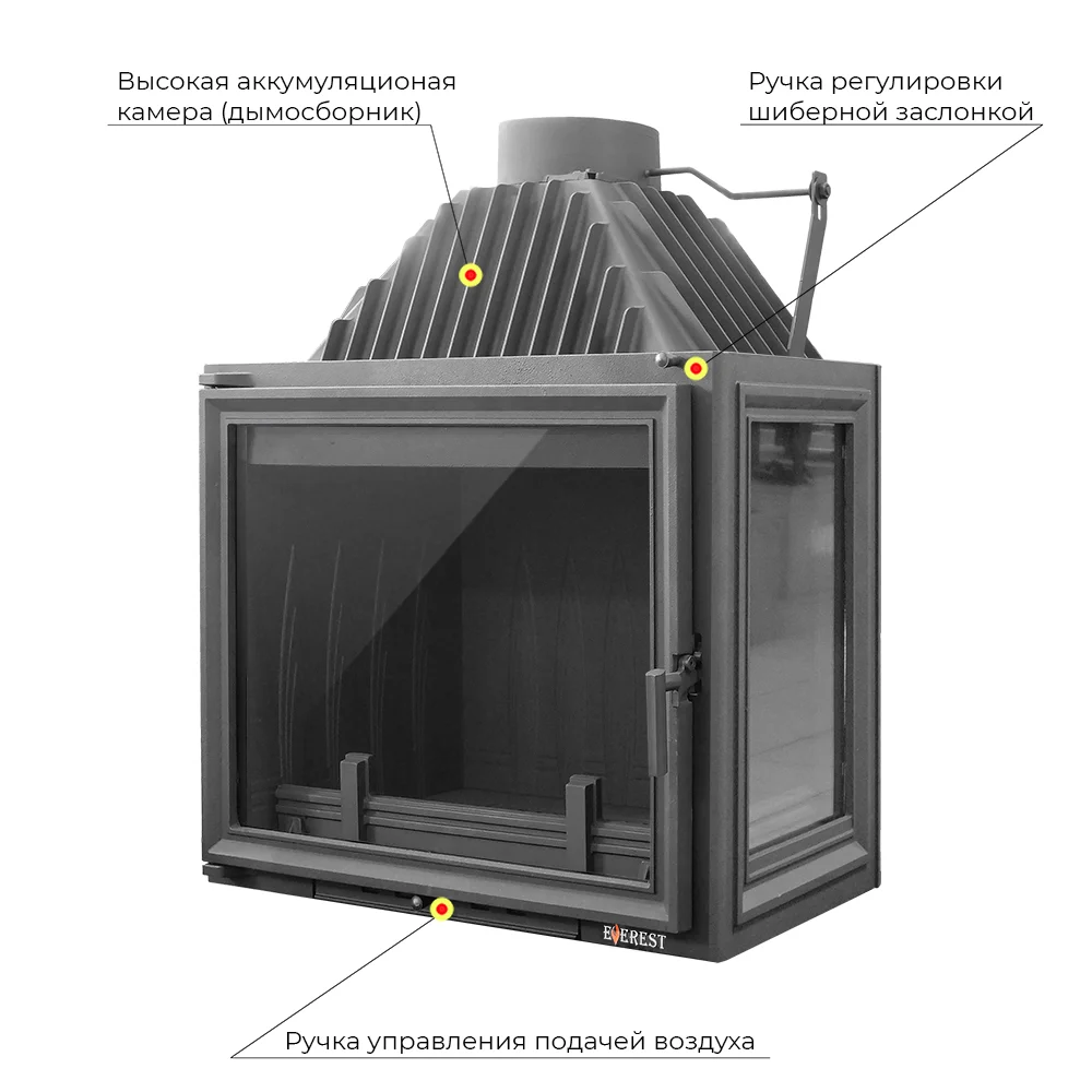 Каминная топка EVEREST A16R имеет с правой стороны дополнительное остекление. Топка изготовлена из качественного жаростойкого чугуна (ГОСТ 1412-85) с толщиной стенок 6-10 мм. Вес топки составляет 186 кг. Модель рассчитана на обогрев помещений объёмом до 320 м³. Каминная топка имеет высокую Аккумуляционную камеру (дымосборник) и часто расположенные радиаторы на корпусе топки , которые обеспечивают высокий КПД и увеличивают мощность до 16 кВт. В Аккумуляционной камере (дымосборнике) установлен чугунный пламегаситель, Патрубок дымохода с внутренним диаметром 203 мм, оснащён поворотным шибером. Заслонка изготовлена из чугуна, а её положение регулируется ручкой на передней панели топки