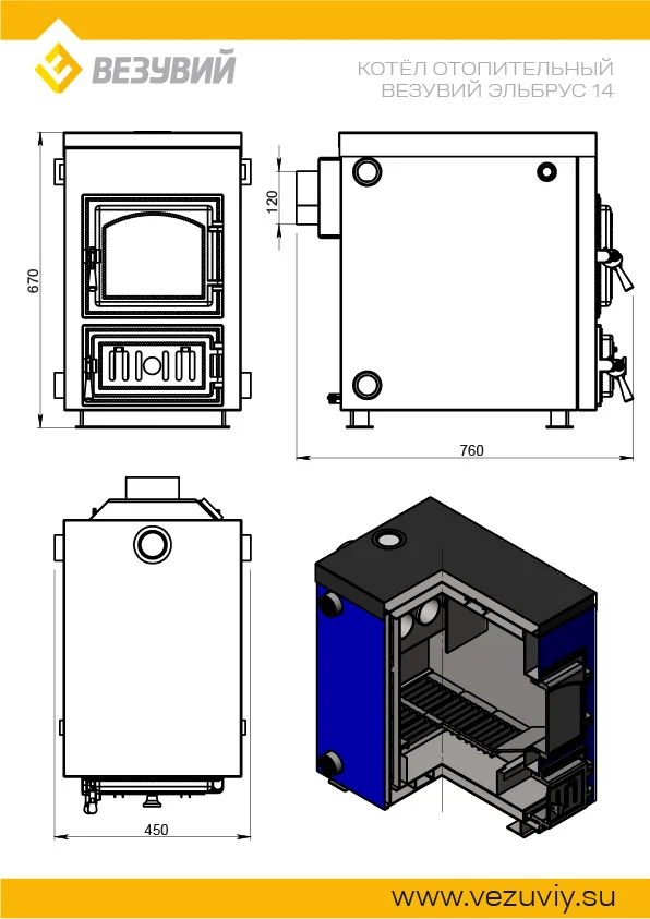 Отопительный водогрейный котёл «Эльбрус с плитой» предназначен для теплоснабжения индивидуальных жилых домов и зданий коммунально-бытового назначения, оборудованных системами водяного отопления с естественной или принудительной циркуляцией, в открытых и закрытых системах отопления. Котлы изготавливаются в исполнении для умеренных и холодно-климатических зон. Устанавливаются котлы в закрытых помещениях с естественной вентиляцией без искусственно-регулируемых климатических условий.Работают на твердом топливе, угле и дровах.В котле предусмотрена возможность установки нагревательного элемента (блока ТЭН).Совок и кочерга в комплекте.Котлы серии «Эльбрус» имеют ряд преимуществ:1. Конструкция котла позволяет работать в системах с давлением теплоносителя до 3-х атмосфер.2. Герметичные чугунные дверцы и система подачи первичного воздуха обеспечивают точную регулировку мощности котла.3. Теплообменник имеет конструкцию, при которой осуществляется простой доступ к теплопроводным поверхностям для их чистки.4. Универсальное подключение котла к системе отопления (с левой или правой стороны).5. Универсальное подключение тягорегулятора и электрического ТЭНа (с левой или правой строны).6. Базальтовая термоизоляция водяного контура.7. До 8 часов горения на одной закладке дров.
