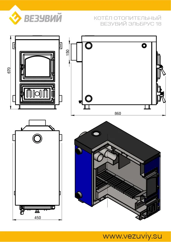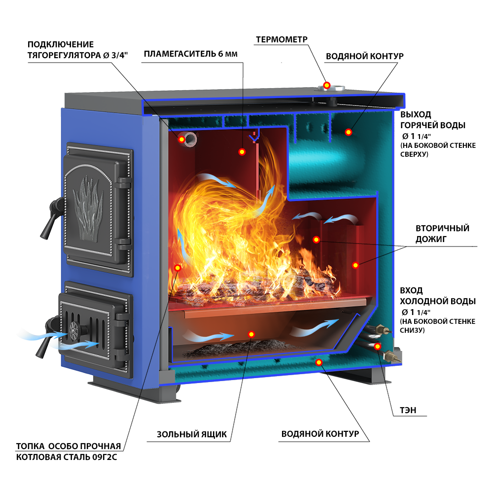 Отопительный водогрейный котёл «Эльбрус с плитой» предназначен для теплоснабжения индивидуальных жилых домов и зданий коммунально-бытового назначения, оборудованных системами водяного отопления с естественной или принудительной циркуляцией, в открытых и закрытых системах отопления. Котлы изготавливаются в исполнении для умеренных и холодно-климатических зон. Устанавливаются котлы в закрытых помещениях с естественной вентиляцией без искусственно-регулируемых климатических условий.Работают на твердом топливе, угле и дровах.В котле предусмотрена возможность установки нагревательного элемента (блока ТЭН).Совок и кочерга в комплекте.Котлы серии «Эльбрус» имеют ряд преимуществ:1. Конструкция котла позволяет работать в системах с давлением теплоносителя до 3-х атмосфер.2. Герметичные чугунные дверцы и система подачи первичного воздуха обеспечивают точную регулировку мощности котла.3. Теплообменник имеет конструкцию, при которой осуществляется простой доступ к теплопроводным поверхностям для их чистки.4. Универсальное подключение котла к системе отопления (с левой или правой стороны).5. Универсальное подключение тягорегулятора и электрического ТЭНа (с левой или правой строны).6. Базальтовая термоизоляция водяного контура.7. До 8 часов горения на одной закладке дров.