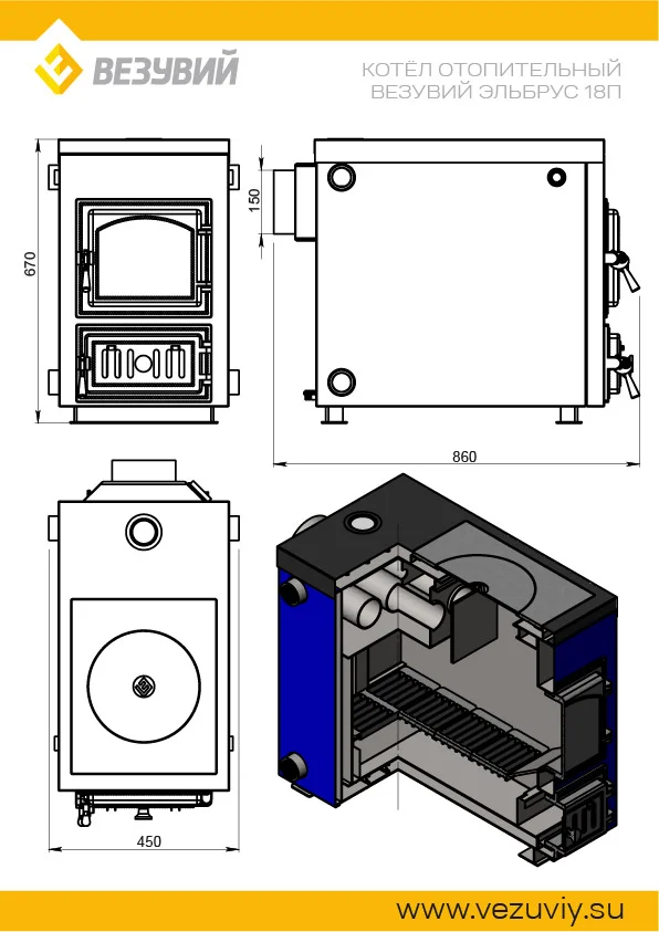 Отопительный водогрейный котёл «Эльбрус с плитой» предназначен для теплоснабжения индивидуальных жилых домов и зданий коммунально-бытового назначения, оборудованных системами водяного отопления с естественной или принудительной циркуляцией, в открытых и закрытых системах отопления.Котлы изготавливаются в исполнении для умеренных и холодно-климатических зон. Устанавливаются котлы в закрытых помещениях с естественной вентиляцией без искусственно-регулируемых климатических условий.Работают на твердом топливе, угле и дровах.В котле предусмотрена возможность установки нагревательного элемента (блока ТЭН).Совок и кочерга в комплекте.Котлы серии «Эльбрус» имеют ряд преимуществ:1. Конструкция котла позволяет работать в системах с давлением теплоносителя до 3-х атмосфер.2. Герметичные чугунные дверцы и система подачи первичного воздуха обеспечивают точную регулировку мощности котла.3. Теплообменник имеет конструкцию, при которой осуществляется простой доступ к теплопроводным поверхностям для их чистки.4. Универсальное подключение котла к системе отопления (с левой или правой стороны).5. Универсальное подключение тягорегулятора и электрического ТЭНа (с левой или правой строны).6. Базальтовая термоизоляция водяного контура.7. Чугунная варочная плита "Везувий".8. До 8 часов горения на одной закладке дров.