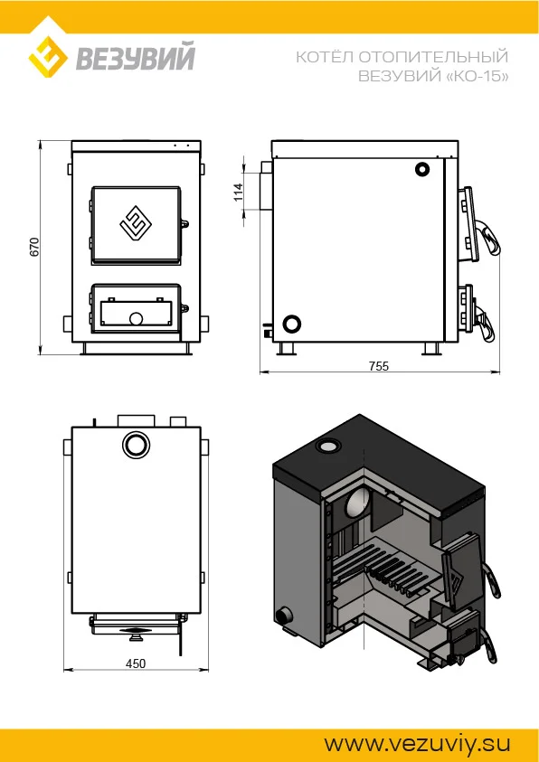 Котлы изготовлены из особо прочной котловой стали марки 09Г2С и предназначены для теплоснабжения индивидуальных жилых домов и зданий коммунально-бытового назначения, оборудованных системами водяного отопления с естественной или принудительной циркуляцией, в открытых и закрытых системах отопления.Котлы изготавливаются в исполнении для умеренных и холодно-климатических зон.Котлы устанавливаются в закрытых помещениях с естественной вентиляцией без искусственно-регулируемых климатических условий.Котлы работают на твердом топливе: дровах и топливных брикетах.В котле предусмотрена возможность установки нагревательного элемента (блока ТЭН). Нагревательный элемент приобретается отдельно.К котлу возможно подключение регулятора, с помощью которого автоматически ограничивается тяга и интенсивность горения дровПреимущества котлов Везувий серии "КО":— конструкция котла позволяет работать в системах с давлением теплоносителя до 3-х атмосфер;— газоплотные дверцы и система подачи первичного воздуха обеспечивают точную регулировку мощности котла;— теплообменник имеет конструкцию, при которой осуществляется простой доступ к теплопроводным поверхностям для их чистки.