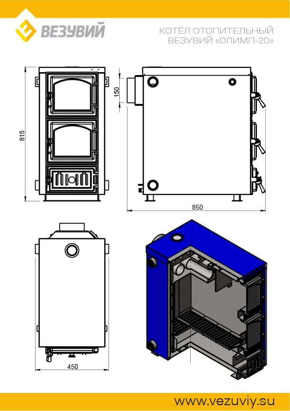 Отопительный водогрейный котёл «Олимп» предназначен для теплоснабжения индивидуальных жилых домов и зданий коммунально-бытового назначения, оборудованных системами водяного отопления с естественной или принудительной циркуляцией, в открытых и закрытых системах отопления.Котлы изготавливаются в исполнении для умеренных и холодно-климатических зон. Устанавливаются котлы в закрытых помещениях с естественной вентиляцией без искусственно-регулируемых климатических условий.Работают на твердом топливе, угле и дровах.В котле предусмотрена возможность установки нагревательного элемента (блока ТЭН) устройства. Совок и кочерга в комплекте. Котлы серии «Олимп» имеют ряд преимуществ:1. Конструкция котла позволяет работать в системах с давлением теплоносителя до 3-х атмосфер;2. Герметичные чугунные дверцы и система подачи первичного воздуха обеспечивают точную регулировку мощности котла;3. Теплообменник имеет конструкцию, при которой осуществляется простой доступ к теплопроводным поверхностям для их чистки.4. Универсальное подлючение котла к системе отопления (с левой или правой строны);5. Универсальное подключение тягорегулятора и электрического ТЭНа (с левой или правой строны);6. Базальтовая термоизоляция водяного контура.7. До 8 часов горения на одной закладке дров.