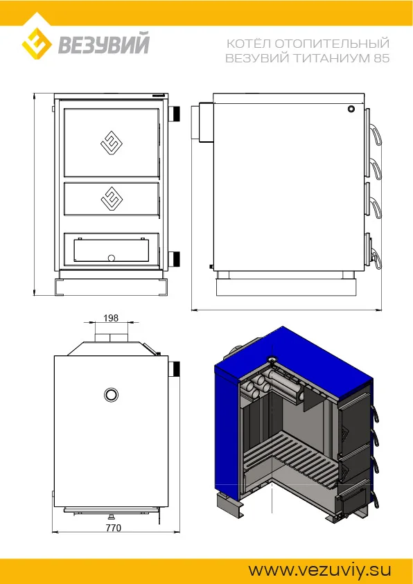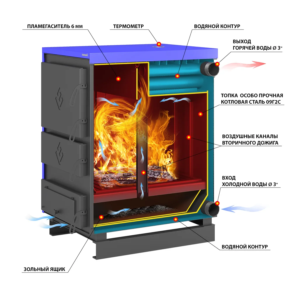 Котел отличается высокой тепловой эффективностью, удобством в использовании и привлекательным внешним видом.Большая топка рассчитана для длительного горения твердого топлива: дров и угля. Расход топлива зависит от утепления дома и сухости дров.Через широкую дверцу легко загружать топливо, производить розжиг, чистку или дозагрузку.При сжигании топлива тепловая энергия передается теплоносителю и по водяной системе отопления распространяется на всю площадь.На верхней поверхности расположен термометр для контроля за температурой воды.Котел оснащен герметичными дверцами, обеспечивающими режим длительного горения. Ручки дверок позволяют полностью прикрывать дверцы и не дают воздуху попадать внутрь топки. С помощью шибера на трубе возможно варьировать процесс горения, увеличивая или уменьшая его.Колосниковая решетка изготовлена из стали 12мм, что обеспечивает ее надежность и прочность.Нижний зольный ящик обладает большим объемом, благодаря чему можно не волноваться о необходимости его постоянной чистки и производить ее по мере необходимости.Подключение дымохода сзади, поэтому нужно заранее рассчитать необходимую площадь для его установки и монтажа труб.