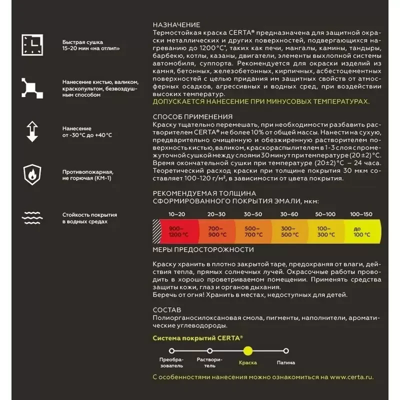 Антикоррозийная термостойкая краска предназначена для защитной антикоррозионной окраски металлического оборудования, работающего в условиях повышенной влажности и температуры, печей для саун, бань, дымовых труб.