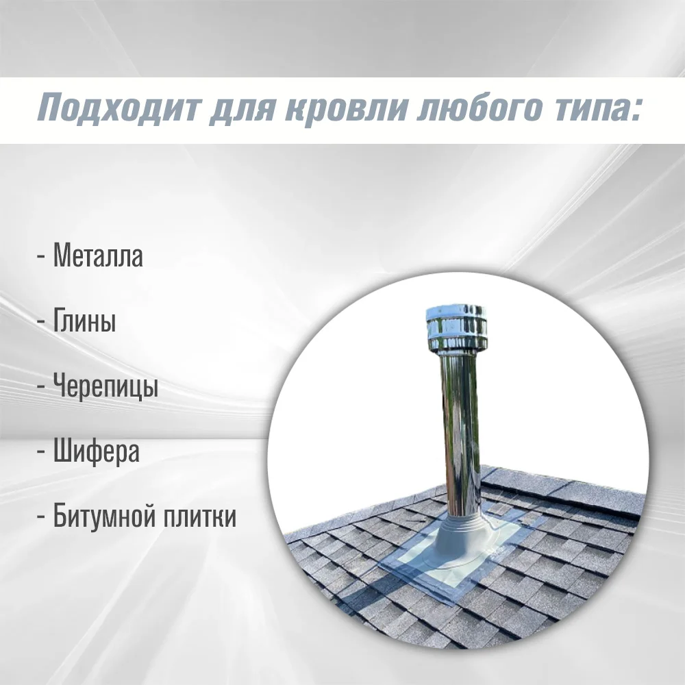 2. Широкие возможности использования Кровельного проходника для дымохода. Это становится возможным благодаря большому размерному ряду. Неважно, какой кровельный проход вы хотите герметизировать, Кровельный проходник для дымохода идеально вам подойдет. 3. Использование на кровлях любого типа. Одно из главных преимуществ Кровельного проходника для дымохода – возможность ее применения на крышах разного типа. Крыша может иметь металлическое покрытие, шиферное или черепичное - Кровельный проходник для дымохода подойдет всегда. Кроме того, Кровельный проходник для дымохода подходит как на прямые, так и на наклонные крыши.