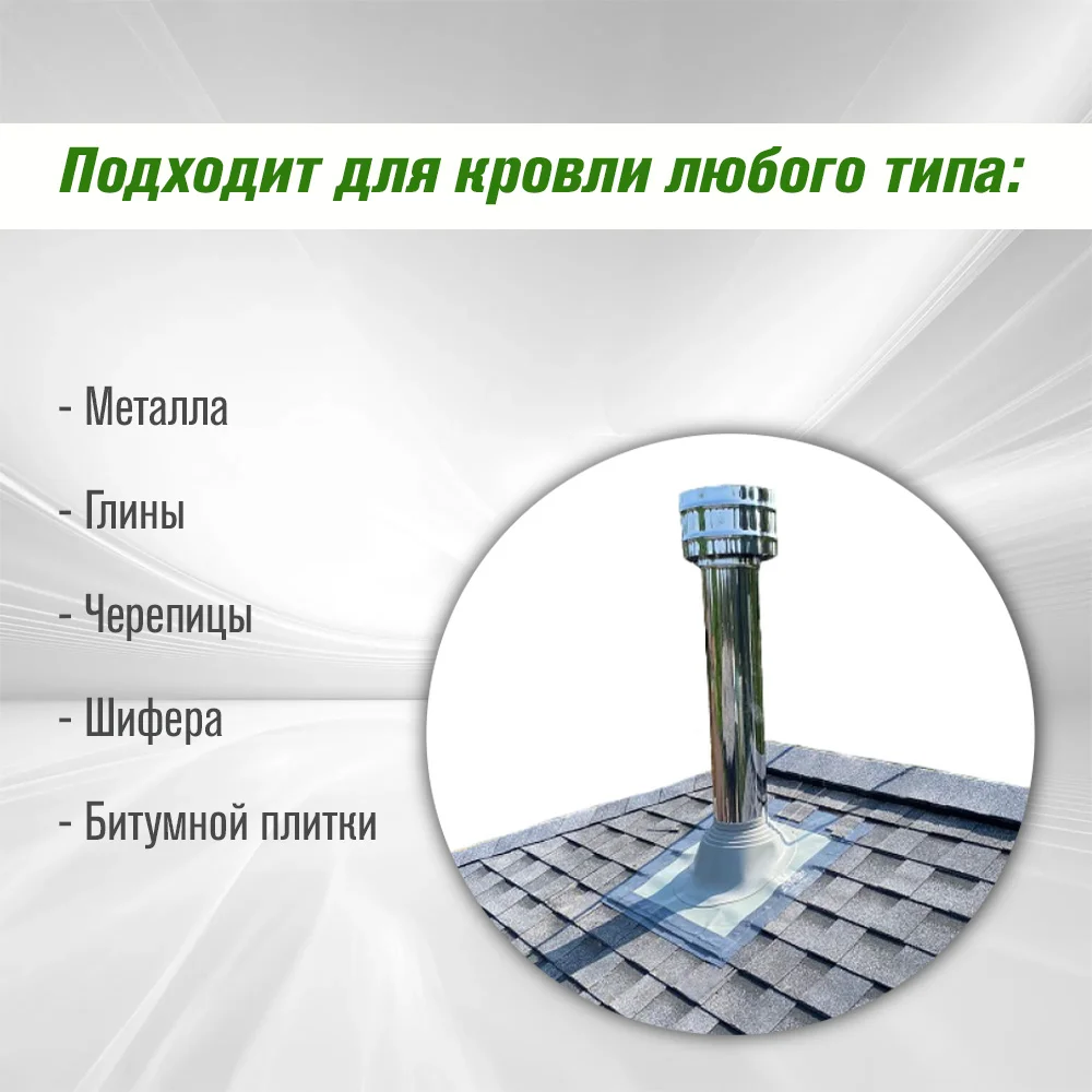 2. Широкие возможности использования Кровельного проходника для дымохода. Это становится возможным благодаря большому размерному ряду. Неважно, какой кровельный проход вы хотите герметизировать, Кровельный проходник для дымохода идеально вам подойдет. 3. Использование на кровлях любого типа. Одно из главных преимуществ Кровельного проходника для дымохода – возможность ее применения на крышах разного типа. Крыша может иметь металлическое покрытие, шиферное или черепичное - Кровельный проходник для дымохода подойдет всегда. Кроме того, Кровельный проходник для дымохода подходит как на прямые, так и на наклонные крыши.