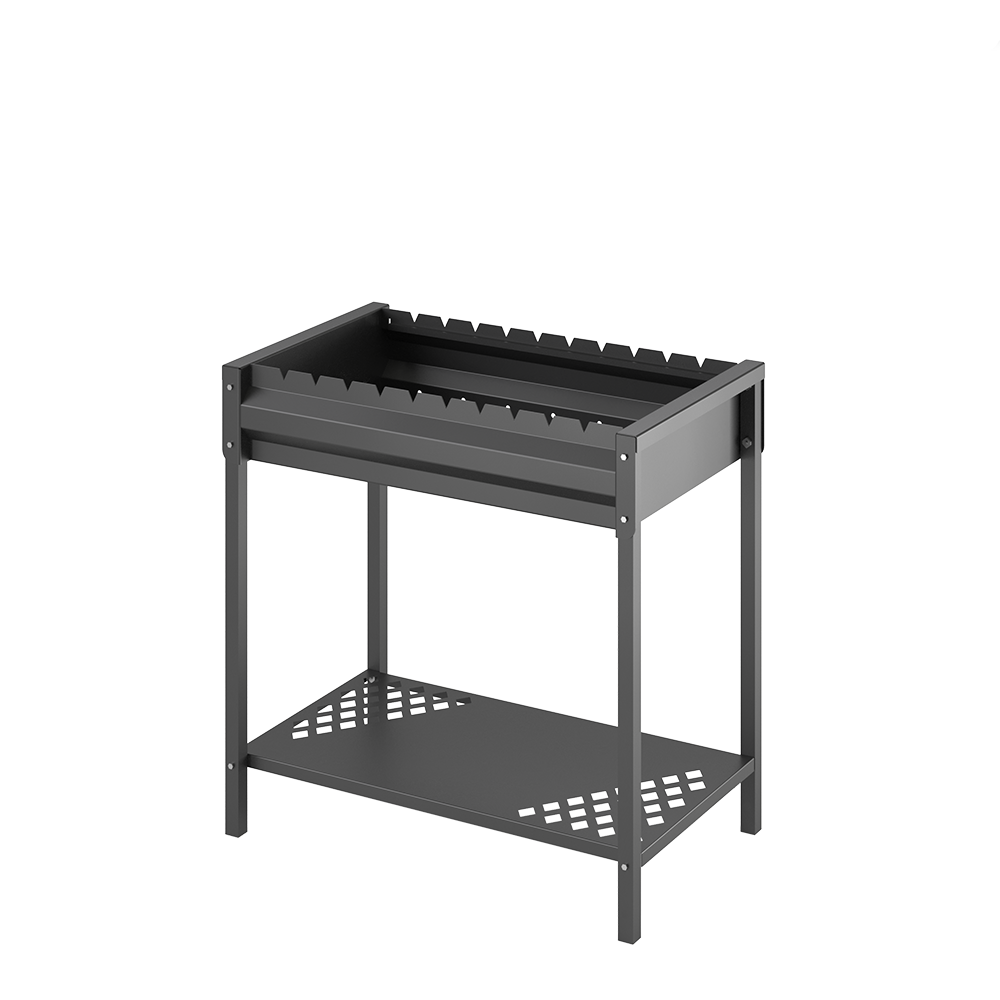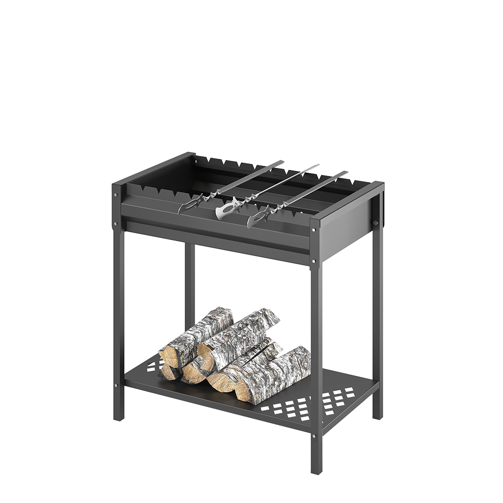 Сборная подставка мангала Кулинар 1 оснащена дополнительной полкой для хранения топлива в нижней части подставки.