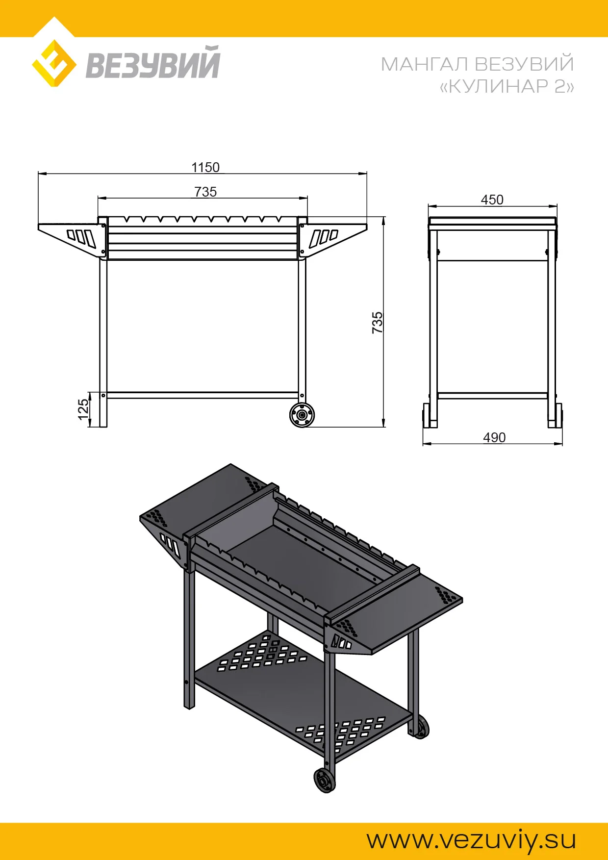 Мангал Кулинар 2 — идеальное решение для настоящих ценителей приготовления вкусной еды на свежем воздухе.Изготовлен мангал из особо прочной котловой стали (09Г2С) и покрыт термостойкой кремнийорганической эмалью. Толщина стали составляет 2 мм. Мангал Кулинар 2 - надежность и стойкость, чтобы вы могли наслаждаться моментами приготовления в любых условиях.У мангала прочные, устойчивые ножки с двумя колесиками для удобства перемещения. Высокие борта предотвращают случайное выпадение углей. Мангал рассчитан на размещение 10 шампуров. Дополнительные боковые полки выполнены из стали толщиной 1мм, на них удобно размещать продукты и кухонную утварь. Специальная усиленная конструкция мангала обеспечивает равномерное распределение тепла и гарантирует идеальный результат при готовке.Устройство легко обслуживать и чистить. Вес мангала составляет 18,9 кг, его удобно переносить и перевозить при необходимости. Под мангалом предусмотрена стальная полка. Полка помимо удобства хранения, отлично усиливает устойчивость мангала, что делает его эксплуатацию еще безопаснее.Мангалы серии «Кулинар» — это идеальное сочетание функциональности и эстетики.Характеристики:Толщина материала: 2 ммПроизводитель:Страна производитель: РоссияМатериал: Особо прочная котловая сталь (09Г2С)Вес: 18,9 кгШирина: 1150 ммВысота: 735 ммГлубина: 450 мм
