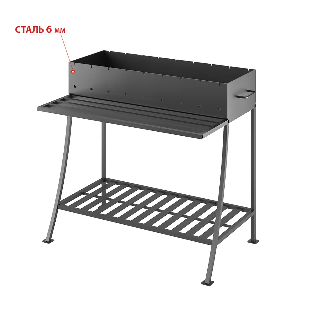 Мангал «Надежный 1000» спереди оснащен удобным столиком, поэтому все необходимое для приготовления пищи, будет всегда «под рукой». В основании мангала предусмотрена решётка, на которой можно хранить дрова или мешок углей.
