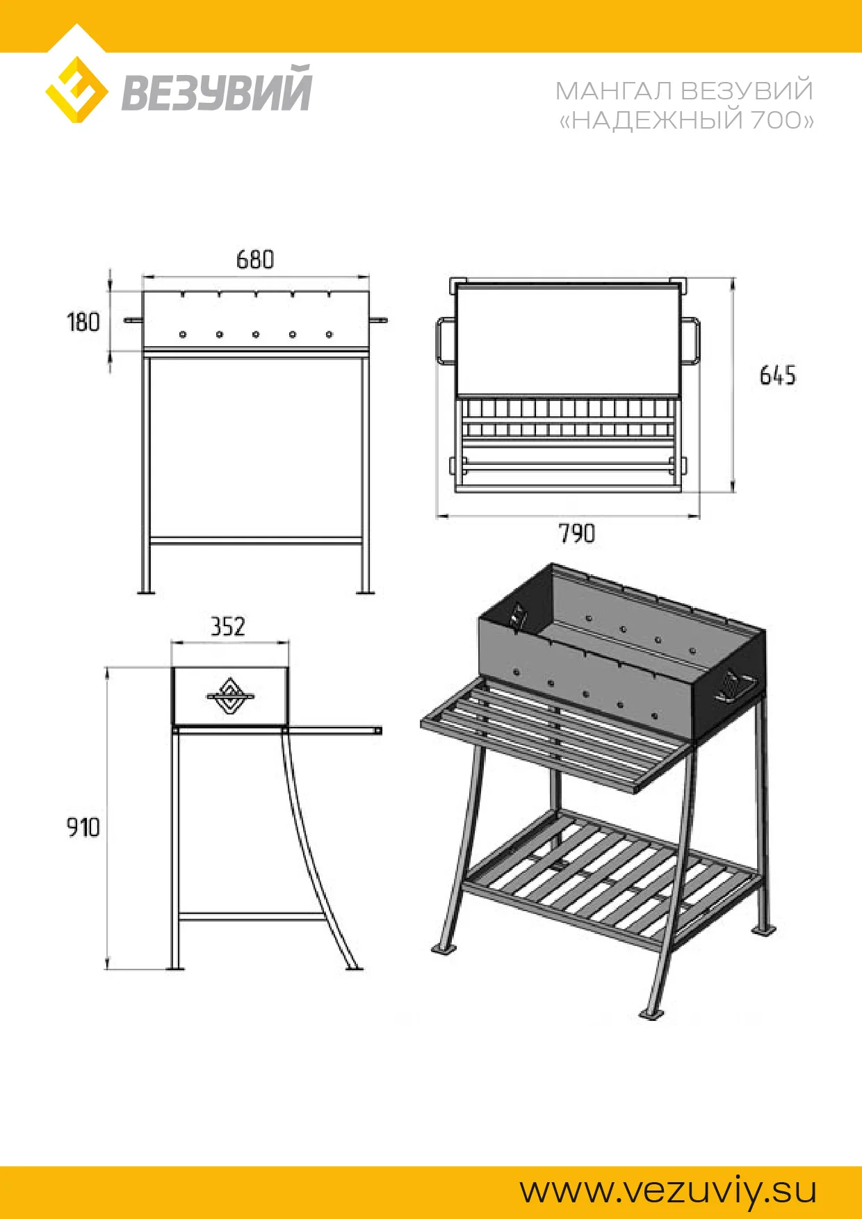 Новая серия мангалов от компании «Везувий» получила вполне заслуженное название - «Надежный», все мангалы данной серии произведены из 6 мм котловой стали и покрыты термостойкой кремнийорганической эмалью. Современное оборудование и технологии производства компании «Везувий» гарантируют высокое качество продукции.Мангалы серии «Надежный» долгие годы будут радовать ценителей дачного отдыха, даря возможность создавать кулинарные шедевры.Мангал «Надежный 700» спереди оснащен удобным столиком, поэтому все необходимое для приготовления пищи, будет всегда «под рукой».В основании мангала предусмотрена решетка, на которой можно хранить дрова или мешок углей.С боков мангал оборудован ручками, делающими удобным перемещение мангала в случае необходимости.Комплектуется крышкой, препятствующей попаданию в мангал мусора и атмосферных осадков, в то время, когда мангал не используется.Ширина мангала 680 мм. Первое использование;Перед использованием мангала по назначению необходимо закрепить покрытие – обжечь в течение 30 минут