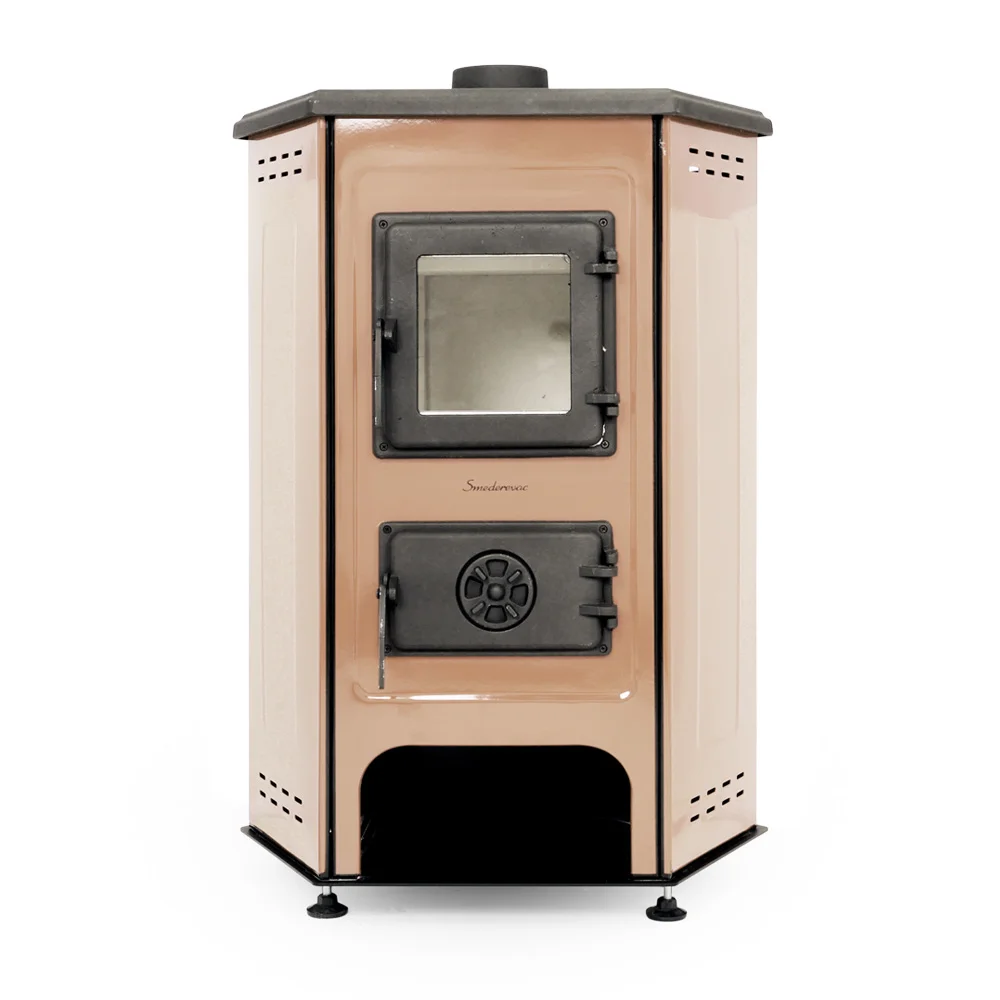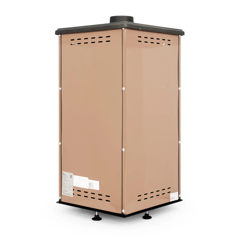 MBS Corner - угловая печь-камин, мощностью 6,1 кВт. Мбс Корнер отлично подойдёт для обогрева небольшого загородного дома или дачи. Топка, футерована шамотным кирпичем, позволит держать тепло до 7 часов. Чугунные элементы печи (зольник, колосник, печные дверцы и верхняя панель) отлично гармонирует со стальными стенками печи, окрашенными в бордовый, черный или бежевый цвет. Подключение дымохода: верхнее, патрубок дымохода крепится двумя болтами и располагается почти посередине верхней крышки печи-камина. Размеры топочной камеры 270х280х300 мм.