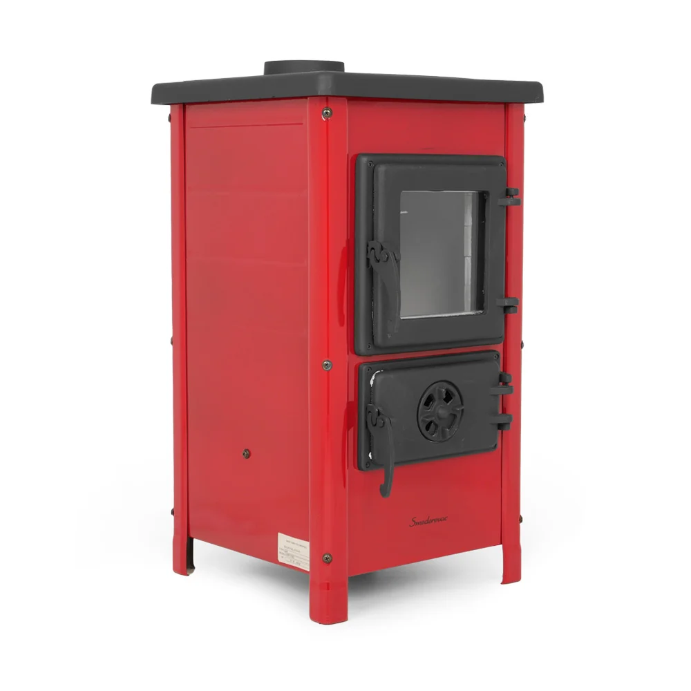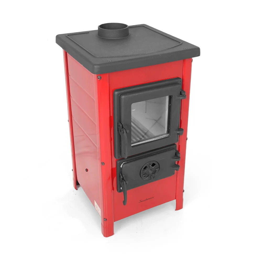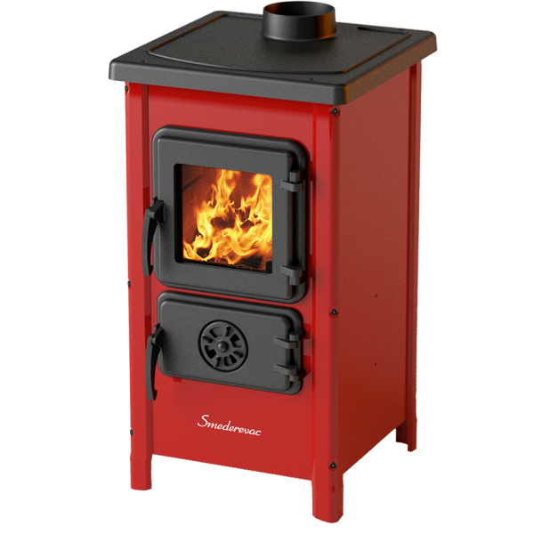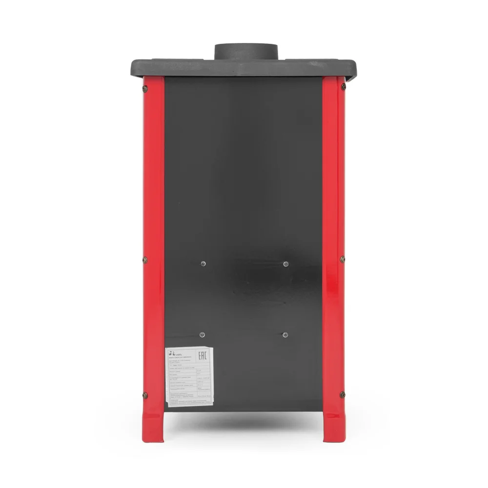 Буржуйка выполнена с высококачественной кованой стали и чугуна. Эмалированные стенки придают печи современный глянцевый дизайн. Эмаль покрыта жаростойкой краской, три цвета: бежевый, бордовый. Дверца топки, зольник, колосник и верхняя крышка выполнены из чугуна и покрыты матовой термостойкой краской. Жаропрочное панорамное стекло SCHOTT ROBAX® производства Германии. Не смотря на компактные размеры (720x400x400мм), мощность печи составляет 6,1 кВт, для отопления площади до 40м². Печь имеет сложную систему воздушного потока , что позволяет использовать печь в режиме тления и длительного горения. Регулировка подачи воздуха осуществляется за счет заслонки на дверцах зольного ящика.