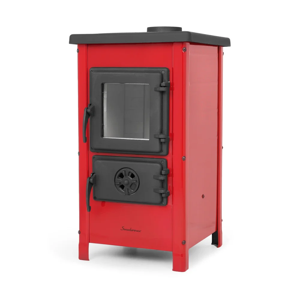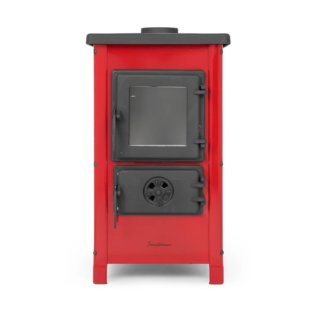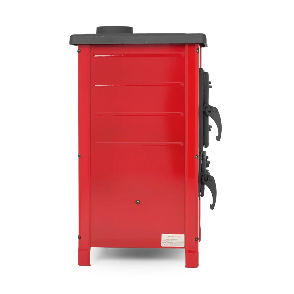 Буржуйка выполнена с высококачественной кованой стали и чугуна. Эмалированные стенки придают печи современный глянцевый дизайн. Эмаль покрыта жаростойкой краской, три цвета: бежевый, бордовый. Дверца топки, зольник, колосник и верхняя крышка выполнены из чугуна и покрыты матовой термостойкой краской. Жаропрочное панорамное стекло SCHOTT ROBAX® производства Германии. Не смотря на компактные размеры (720x400x400мм), мощность печи составляет 6,1 кВт, для отопления площади до 40м². Печь имеет сложную систему воздушного потока , что позволяет использовать печь в режиме тления и длительного горения. Регулировка подачи воздуха осуществляется за счет заслонки на дверцах зольного ящика.